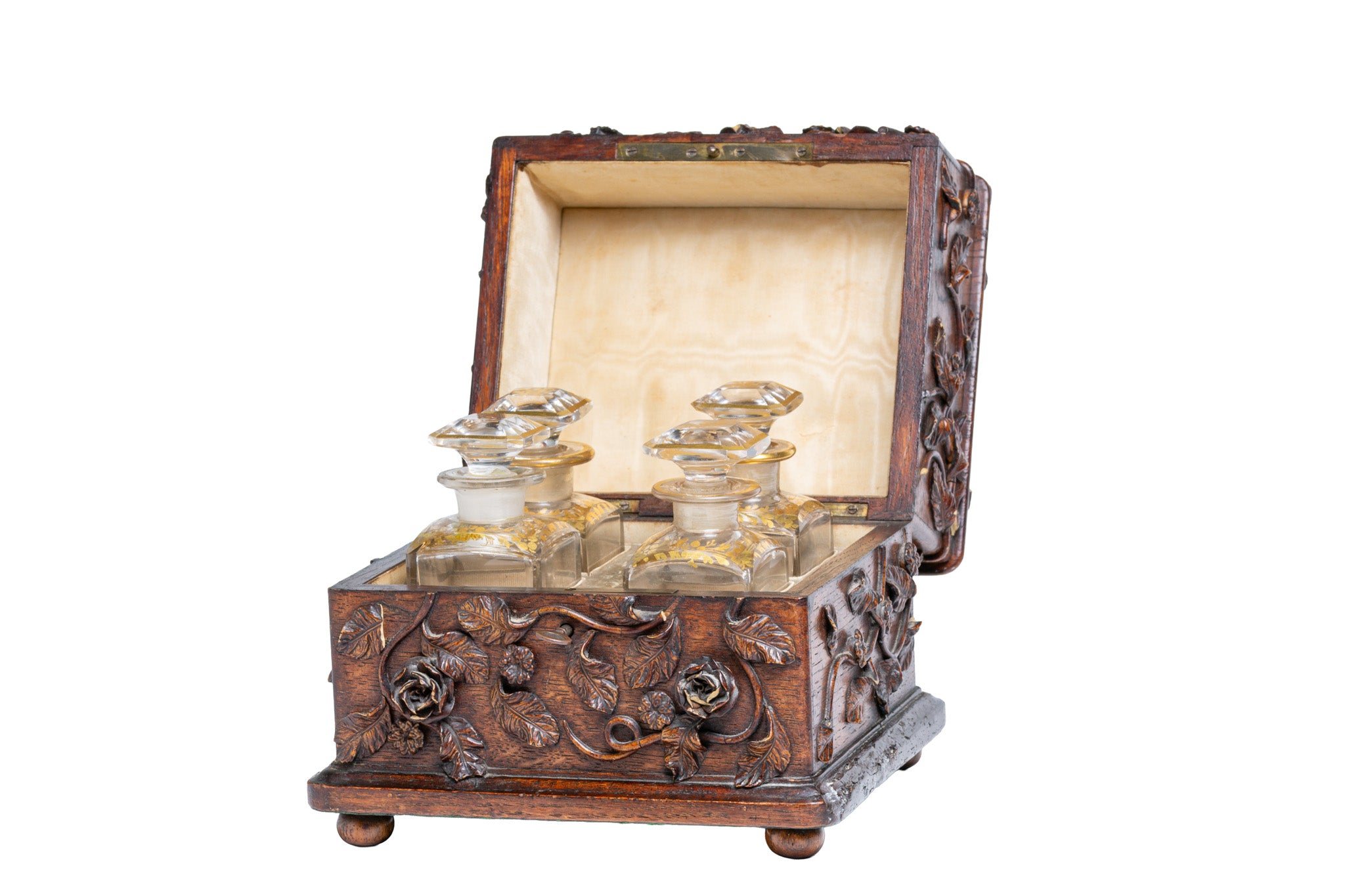A 19th Century French Black Forest Rose Carved Box With Scent Bottles