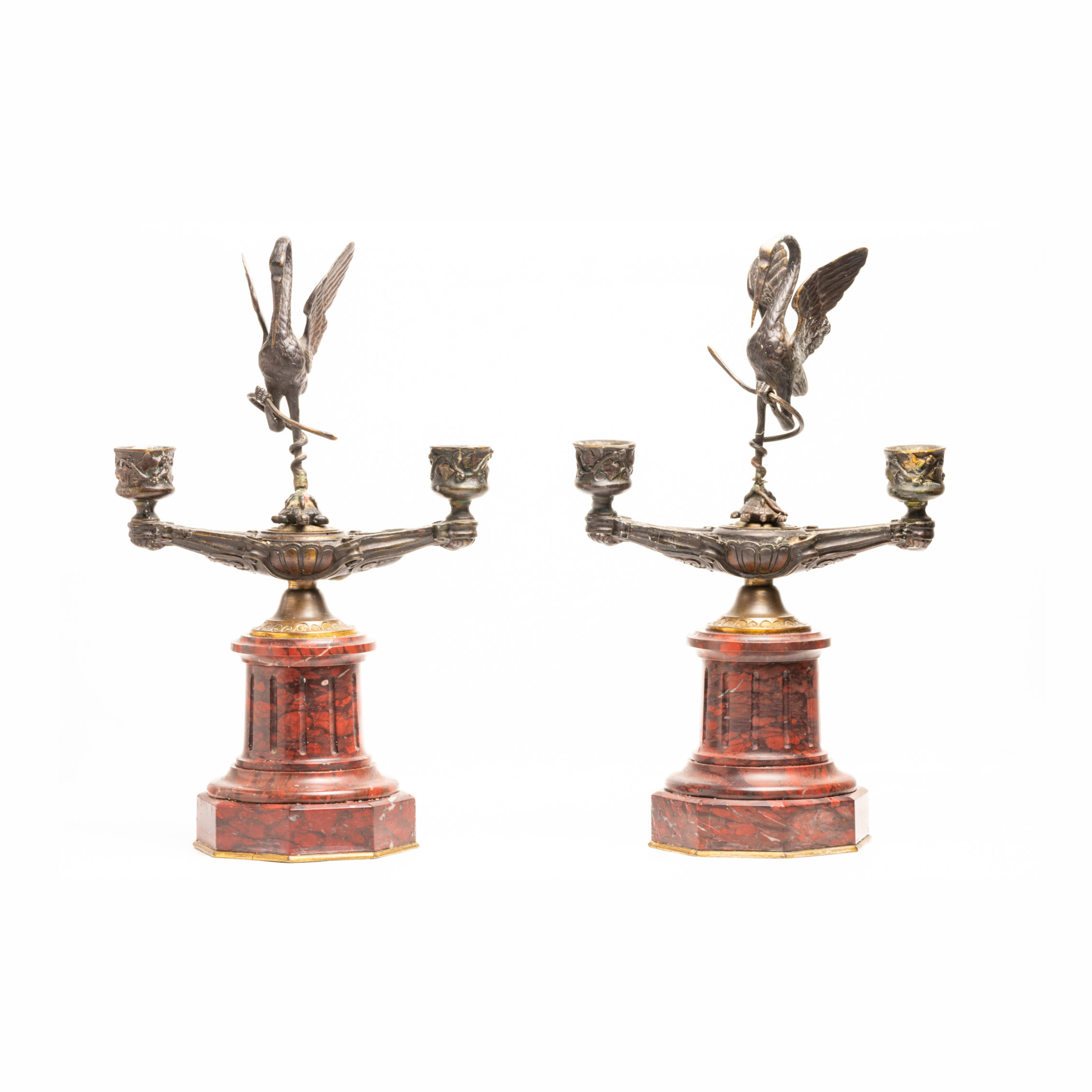 This antique 19th-century pair of bronze and red marble candlesticks with a figure of a crane standing on the back of a turtle is dated circa 1890 during the Japonisme movement and inspired by Japanese aesthetics and craftsmanship. The majestic and beautiful crane is standing on one leg of the turtle with the other one holding a snake. An extraordinary and original piece with a lot of symbolism. The figure represents 'longevity and conjugal happiness'. The crane (Tsuru) is said to live 1000 years, while the turtle (Kame) is considered to have a lifespan of 10,000 years. The crane chooses its partner for life; the turtle is capable of a great friendship. The crane represents good fortune and longevity. The candlesticks are also decorated with ivy and stand on the octagonal red marble columns.