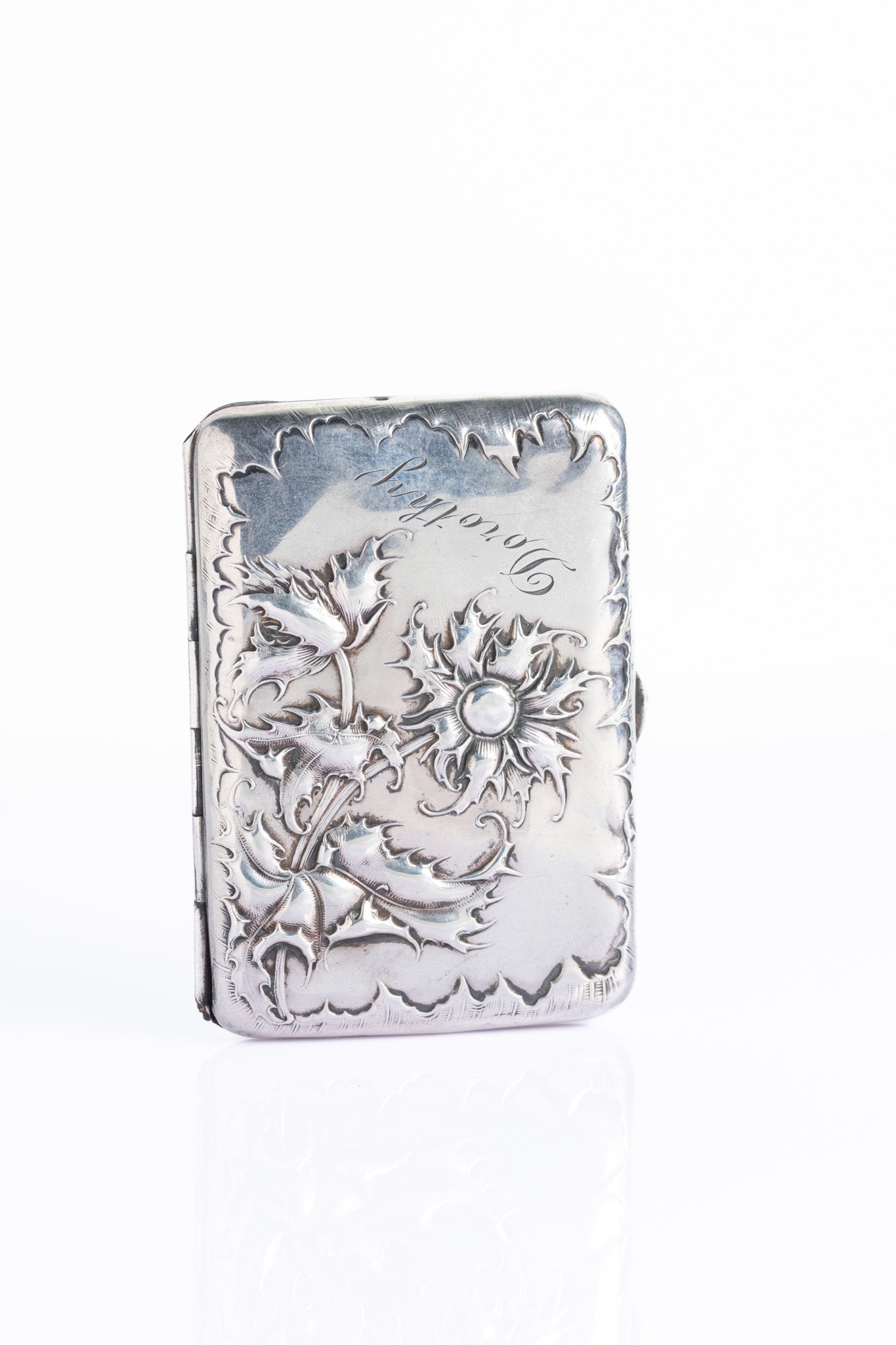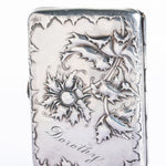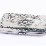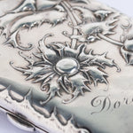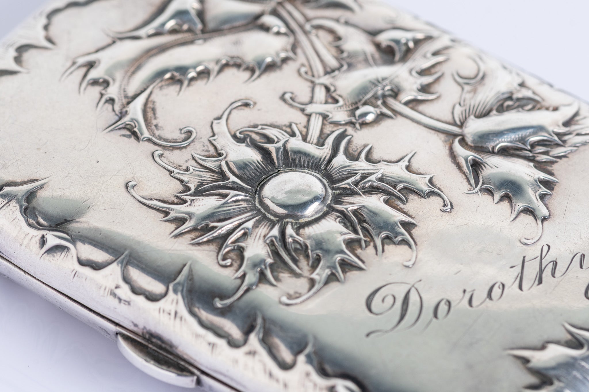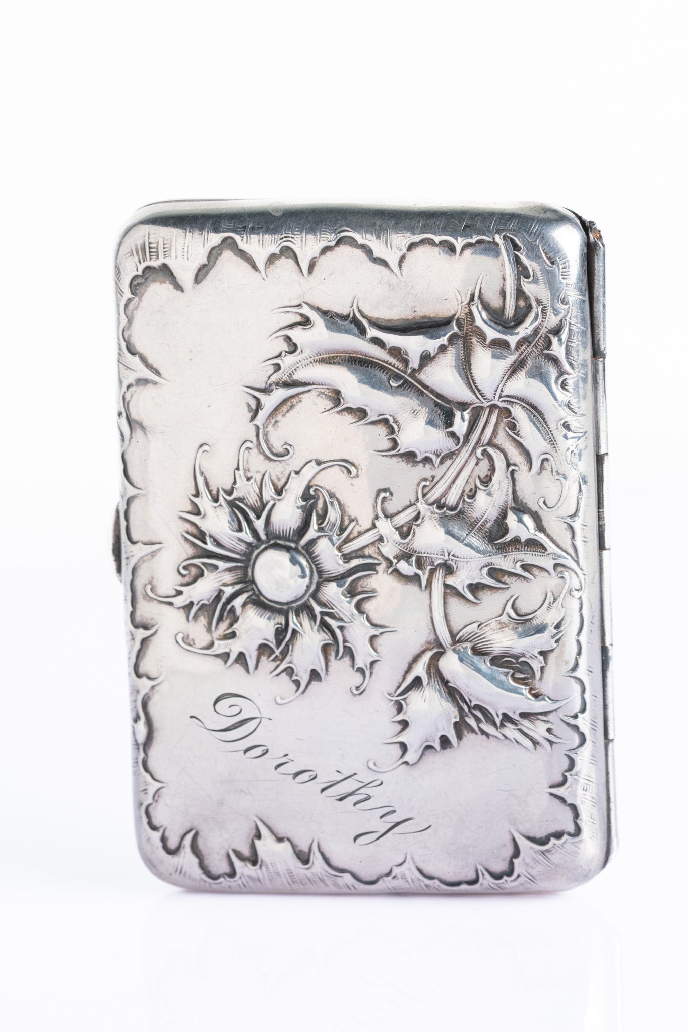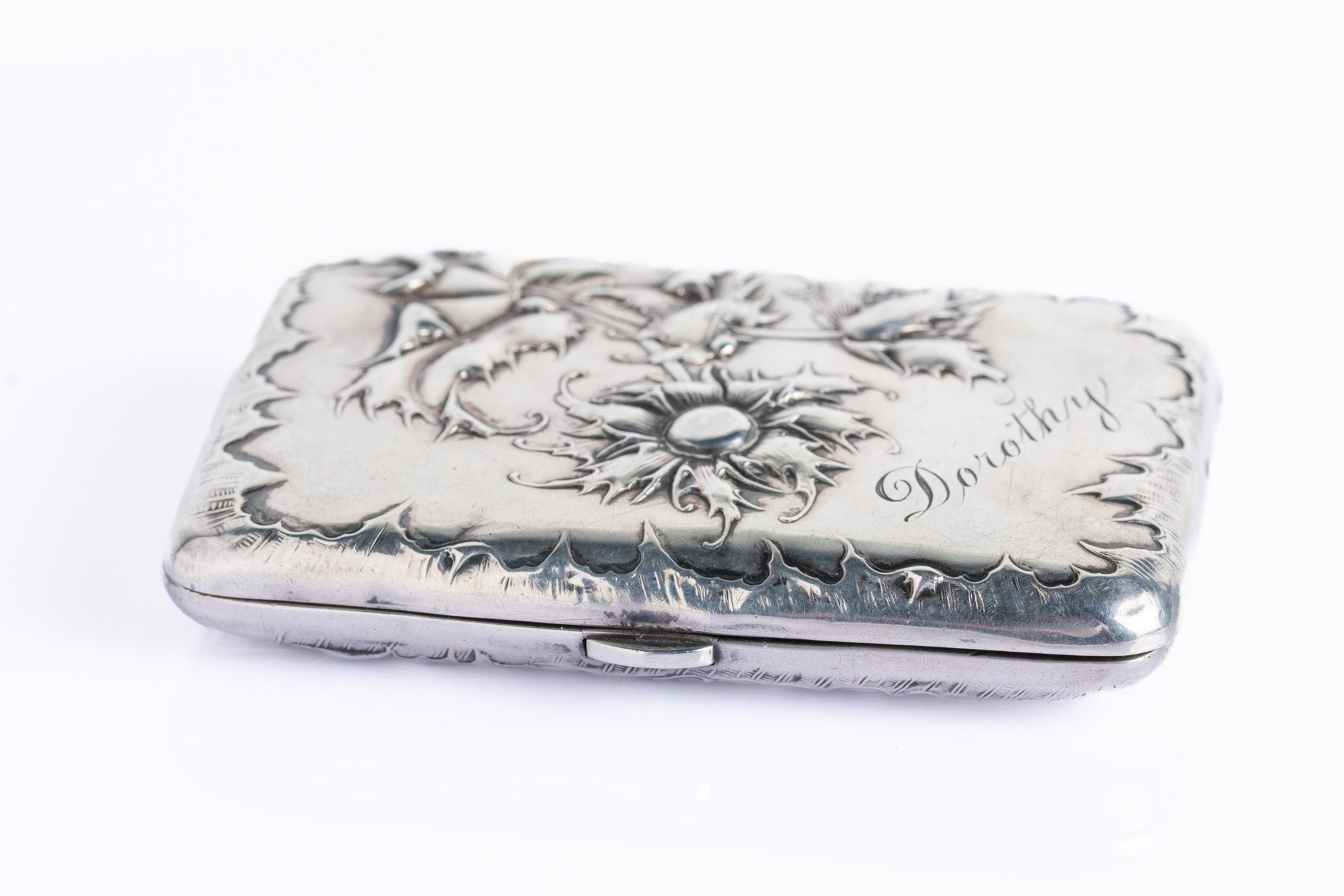 A beautiful and rare antique German silver cigarette case with a sunflower repoussé and scrolling foliage decoration, with the name Dorothy engraved on the front.