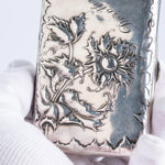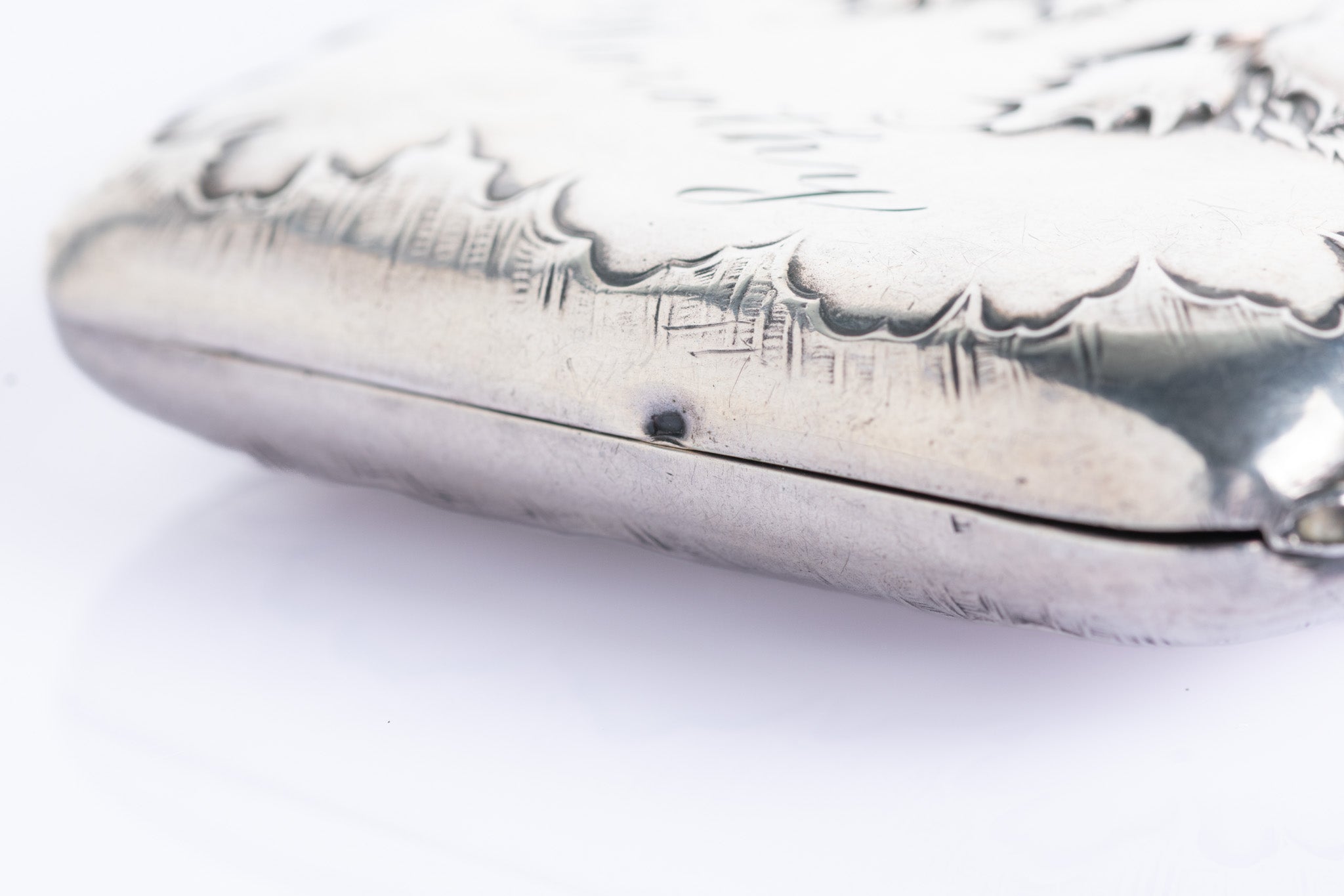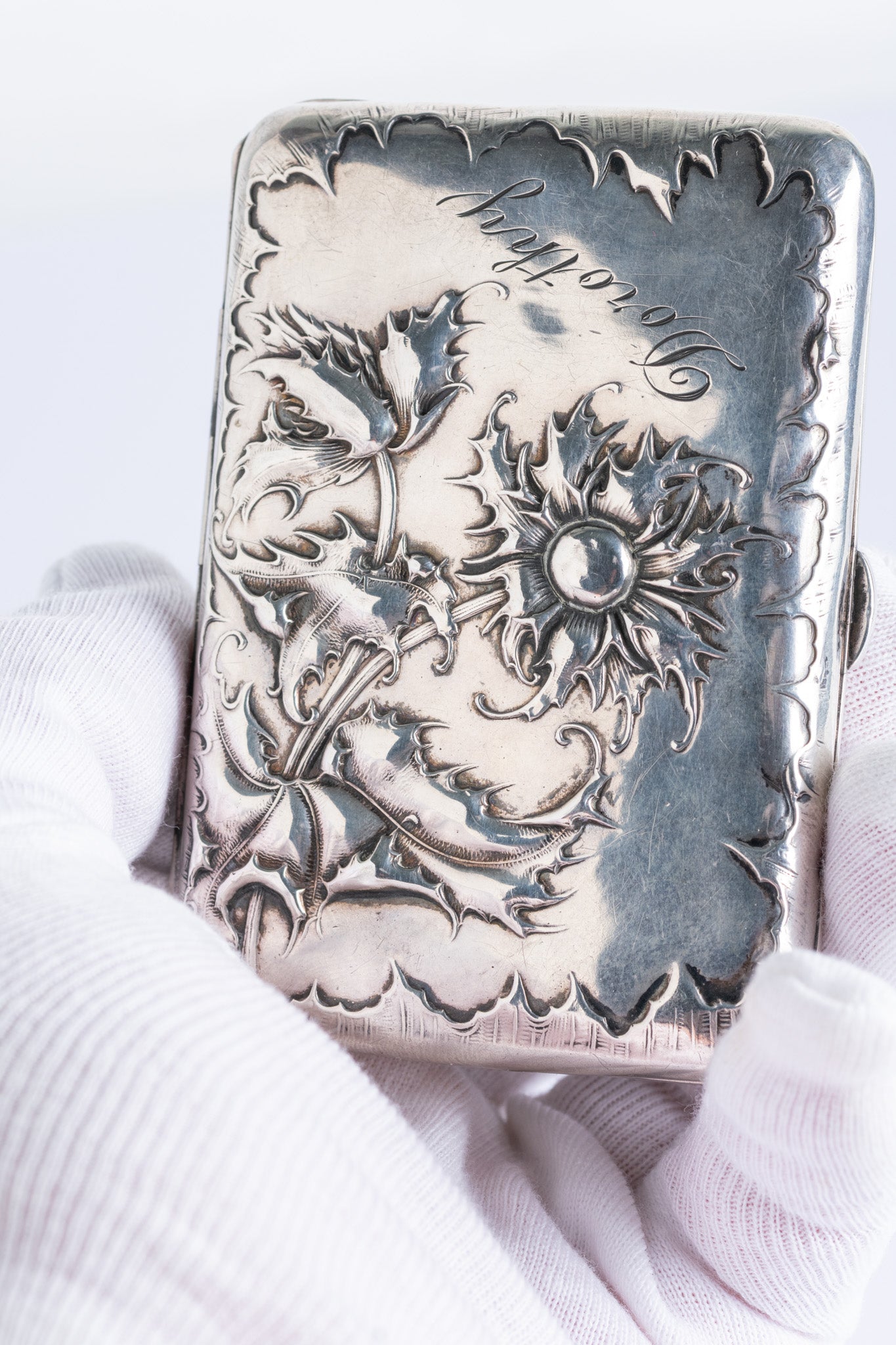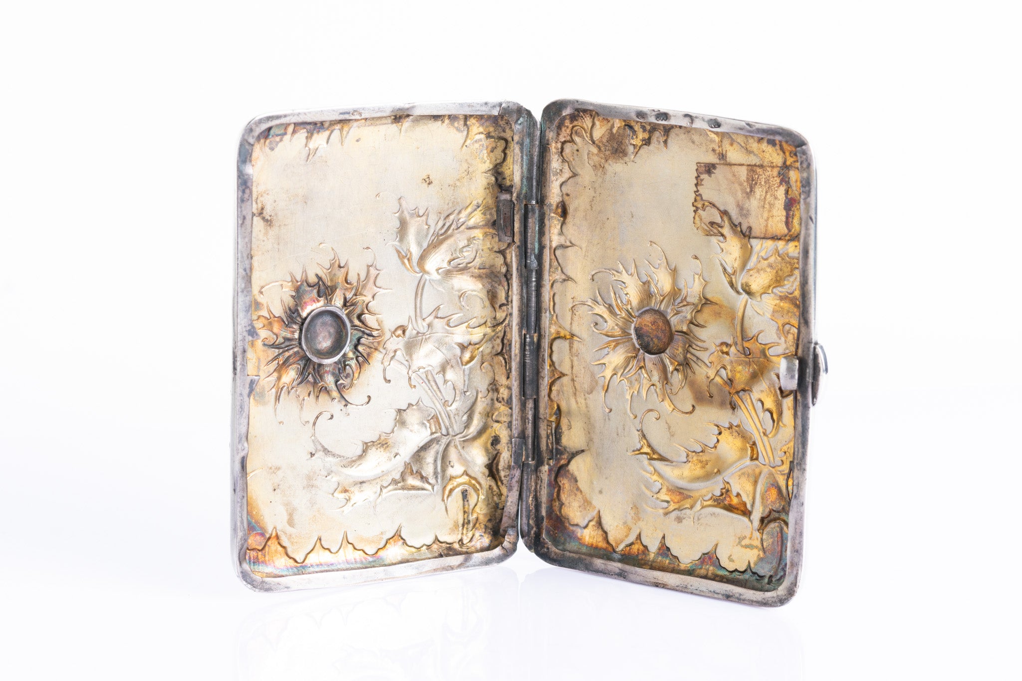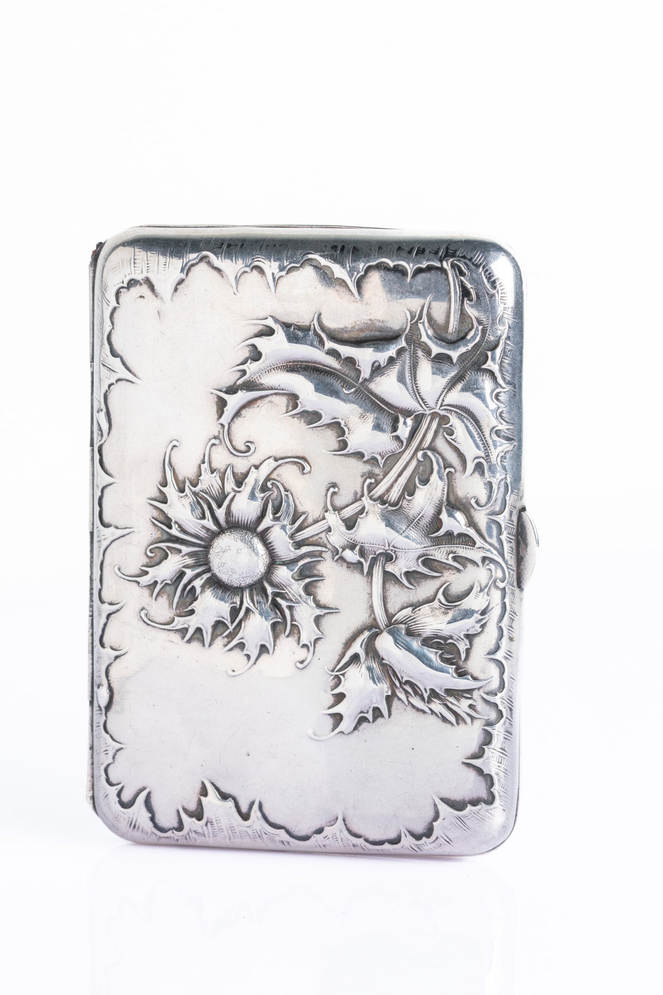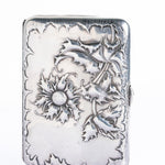 Dating to around 1890–1910, this case reflects the late 19th-century fascination with bold naturalistic floral motifs, popular in both the Aesthetic and early Art Nouveau movements. The sunflower, a symbol of loyalty and vitality, was a popular decorative element of the period. Hallmarked with the crescent moon and crown national hallmark alongside 800 for silver fineness.