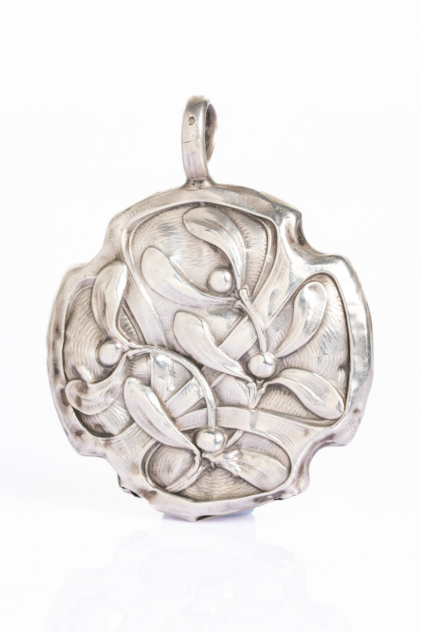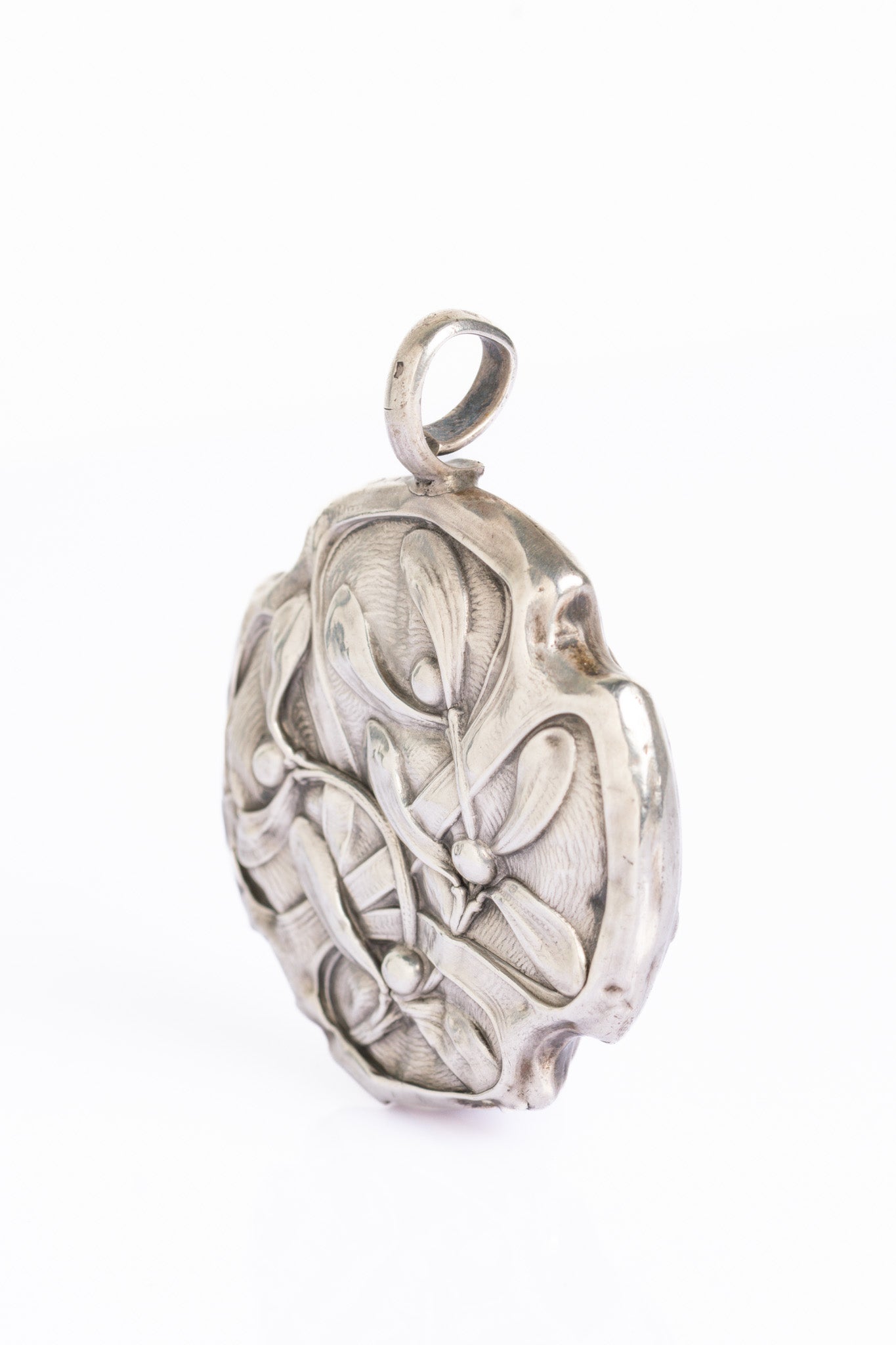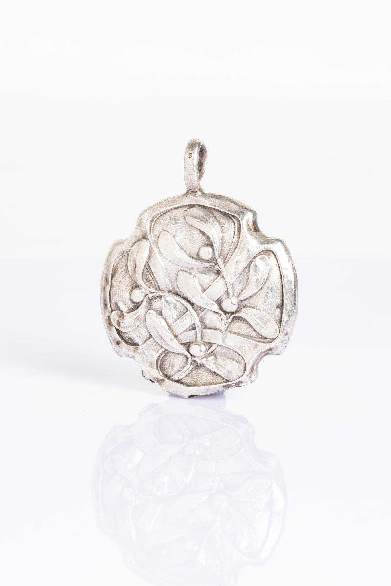 A rare and charming Art Nouveau silver pendant, originally designed as a rattle charm, beautifully decorated with entwined mistletoe leaves and berries - a timeless symbol of love, renewal, and protection.