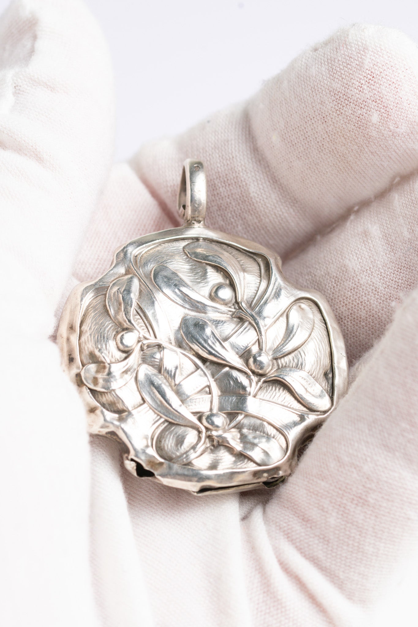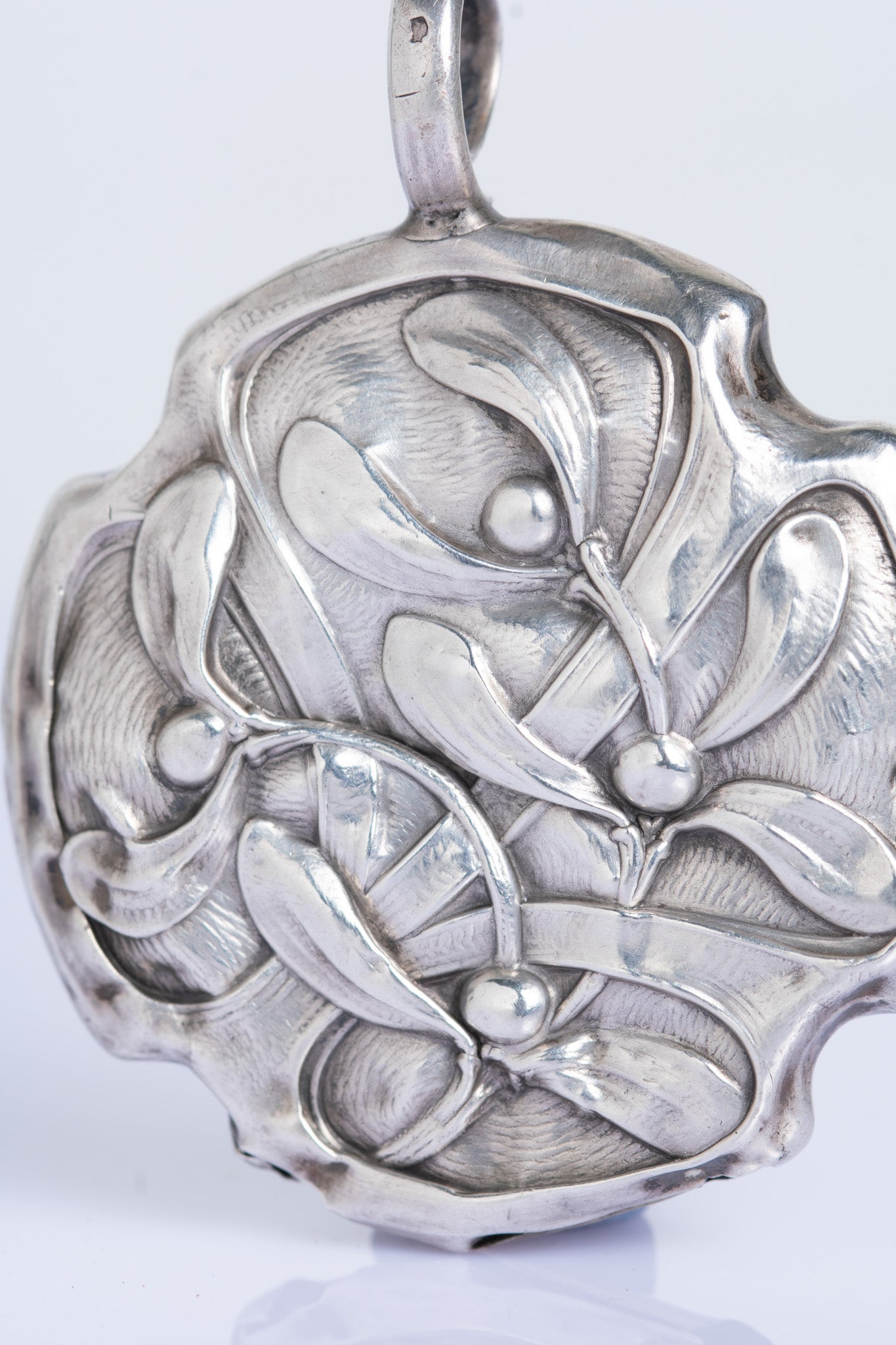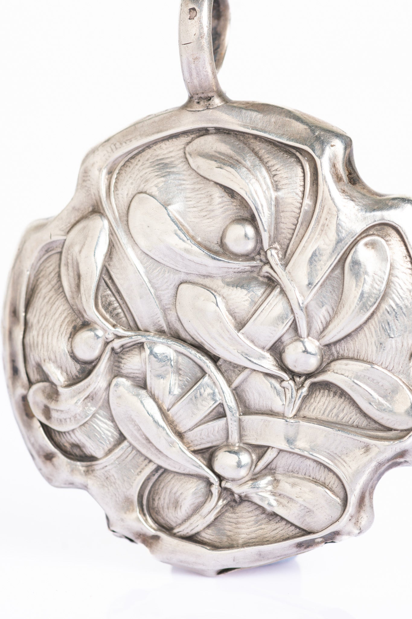 A rare and charming Art Nouveau silver pendant, originally designed as a rattle charm, beautifully decorated with entwined mistletoe leaves and berries - a timeless symbol of love, renewal, and protection.
