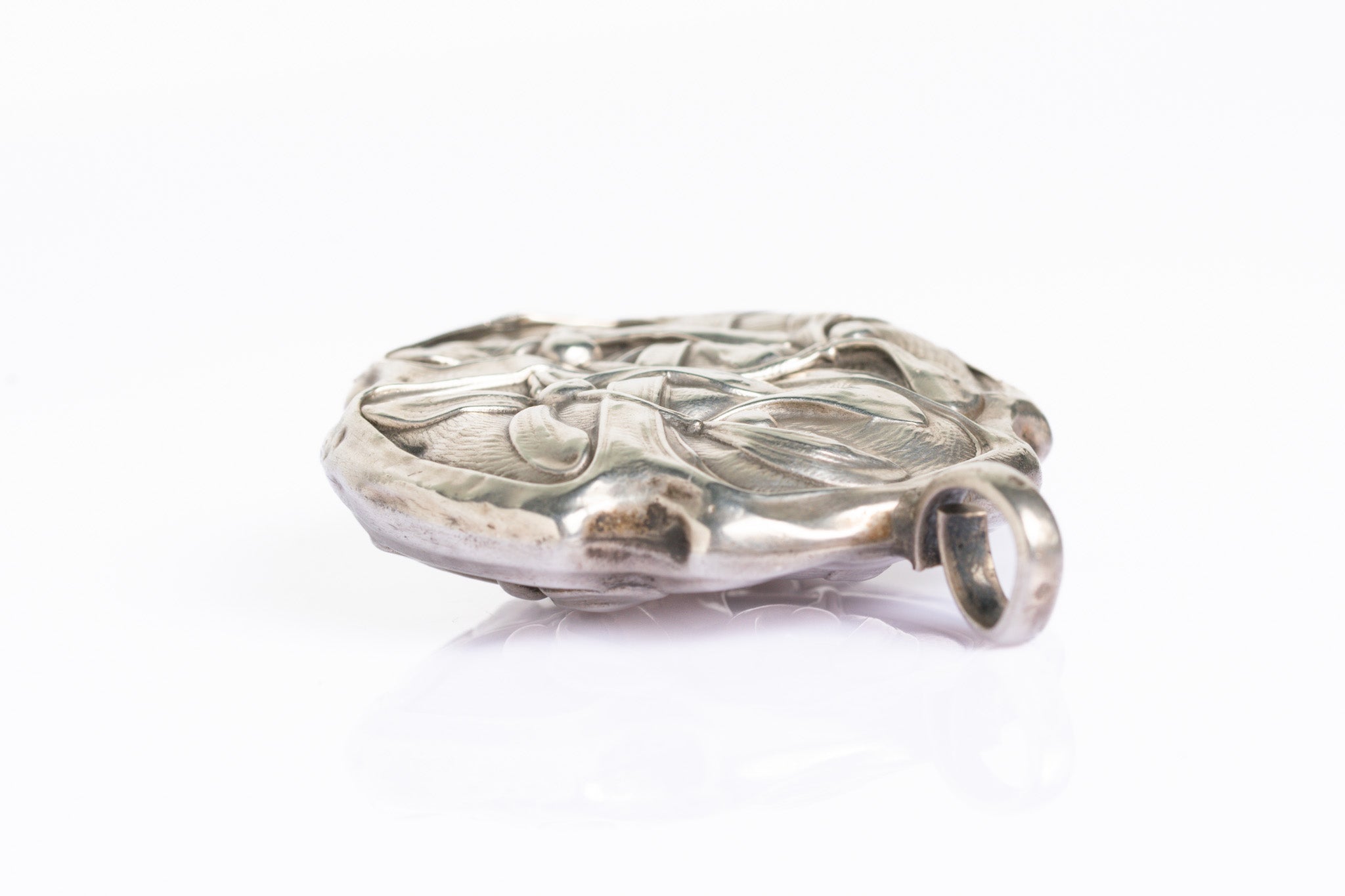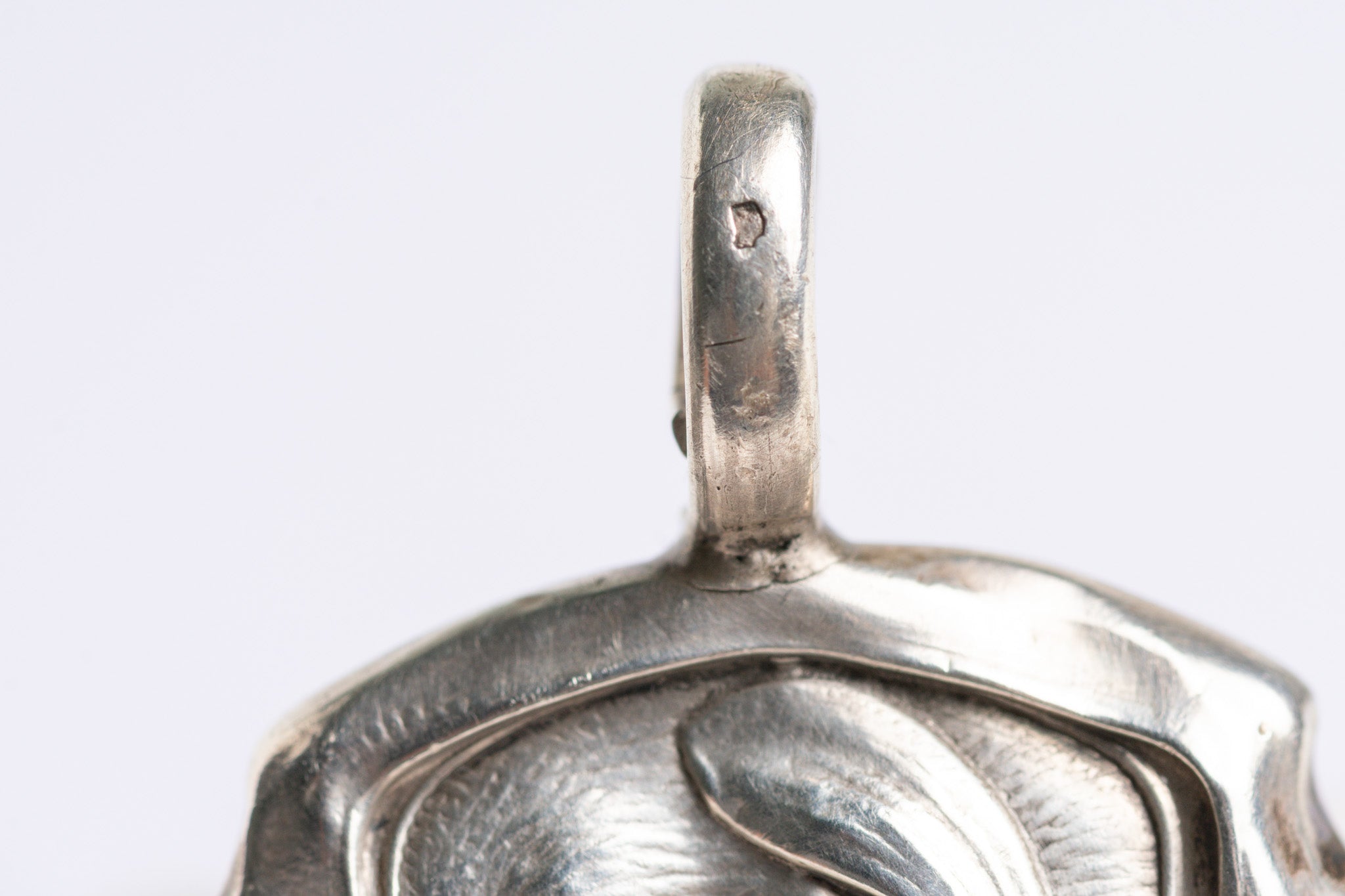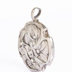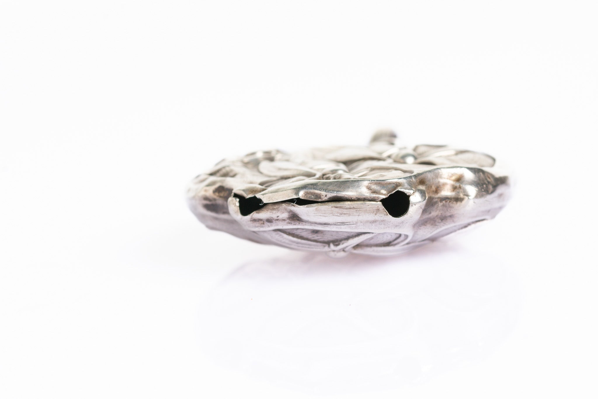 The pendant is crafted in solid silver with exquisite high-relief detailing and softly aged patina. Inside, it contains a small internal rattle element that produces a gentle sound when moved — a delightful feature typical of late 19th–early 20th century keepsake jewellery. This piece would have likely been given as a sentimental token, perhaps for a christening or as a symbol of affection, later repurposed as a pendant. Stamped with a French hallmark.