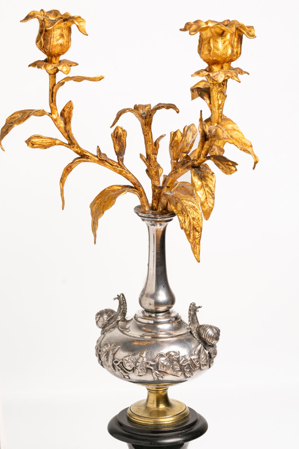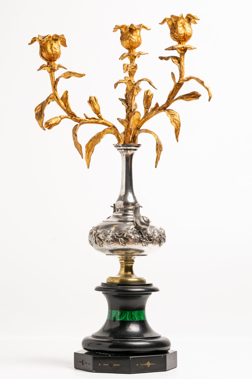 This exquisite early 19th century French candelabra is a masterful work of artistry. The piece is cast in black marble and gilt bronze with the exceptional silver plated design decorated with a pair of snails and ivy standing on an heavy octagonal black marble plinth. The top of the plinth has a mounted malachite decoration together with a small quadrangle design surrounding the bottom of the marble base.