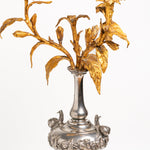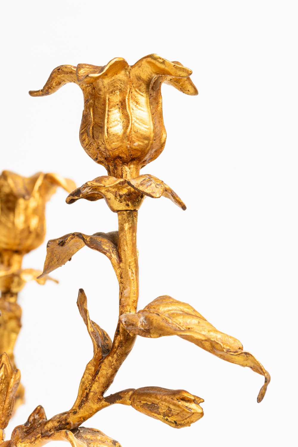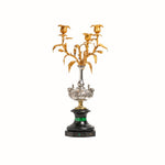 This three branch candelabra is adorned with delicate and very detailed gilt bronze leaves and buds. Each arm rises to a floral candle nozzles, each designed with subtle foliate collars.