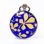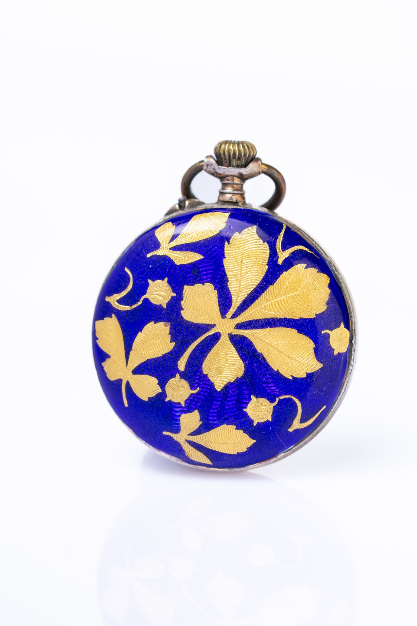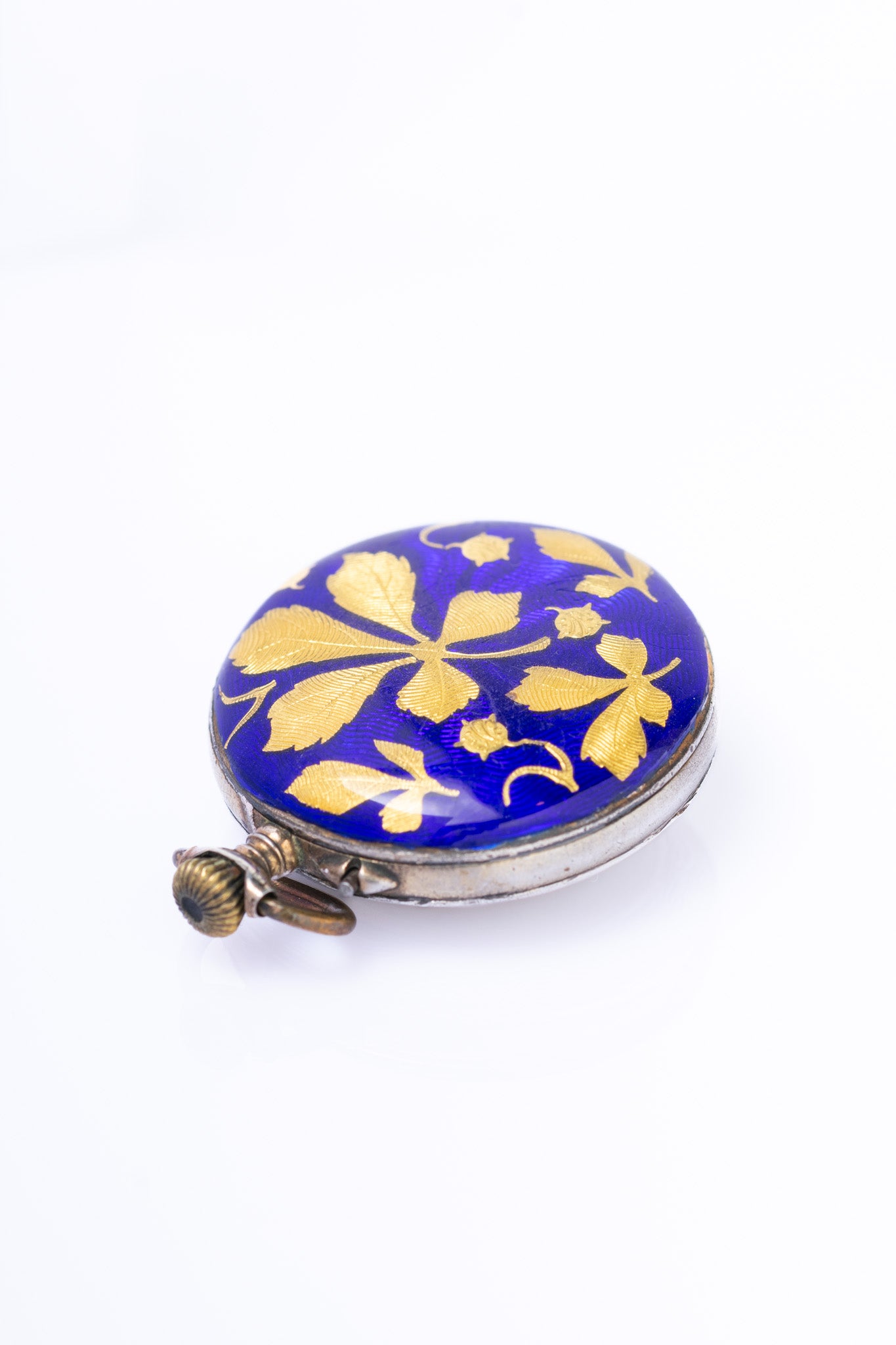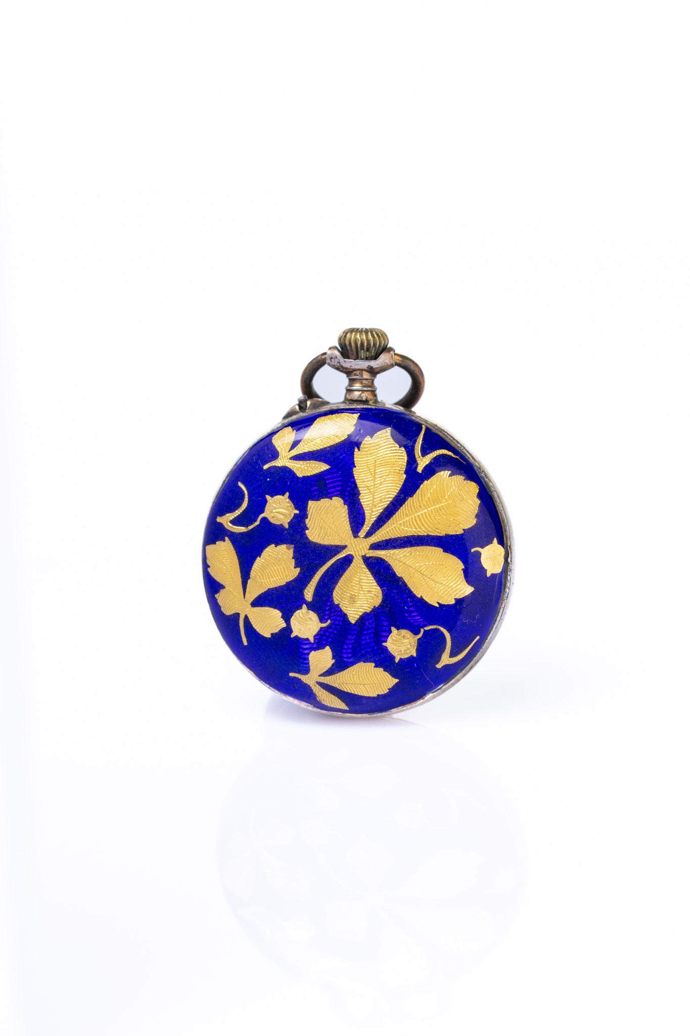 A charming antique Swiss pendant watch, dating to the late 19th / early 20th century (circa 1900), housed in a beautifully decorated silver case. The reverse is finished in rich cobalt-blue guilloché enamel, overlaid with applied gold chestnut leaf motifs, creating a beautiful contrast that reflects the refined taste of the Belle Époque period.