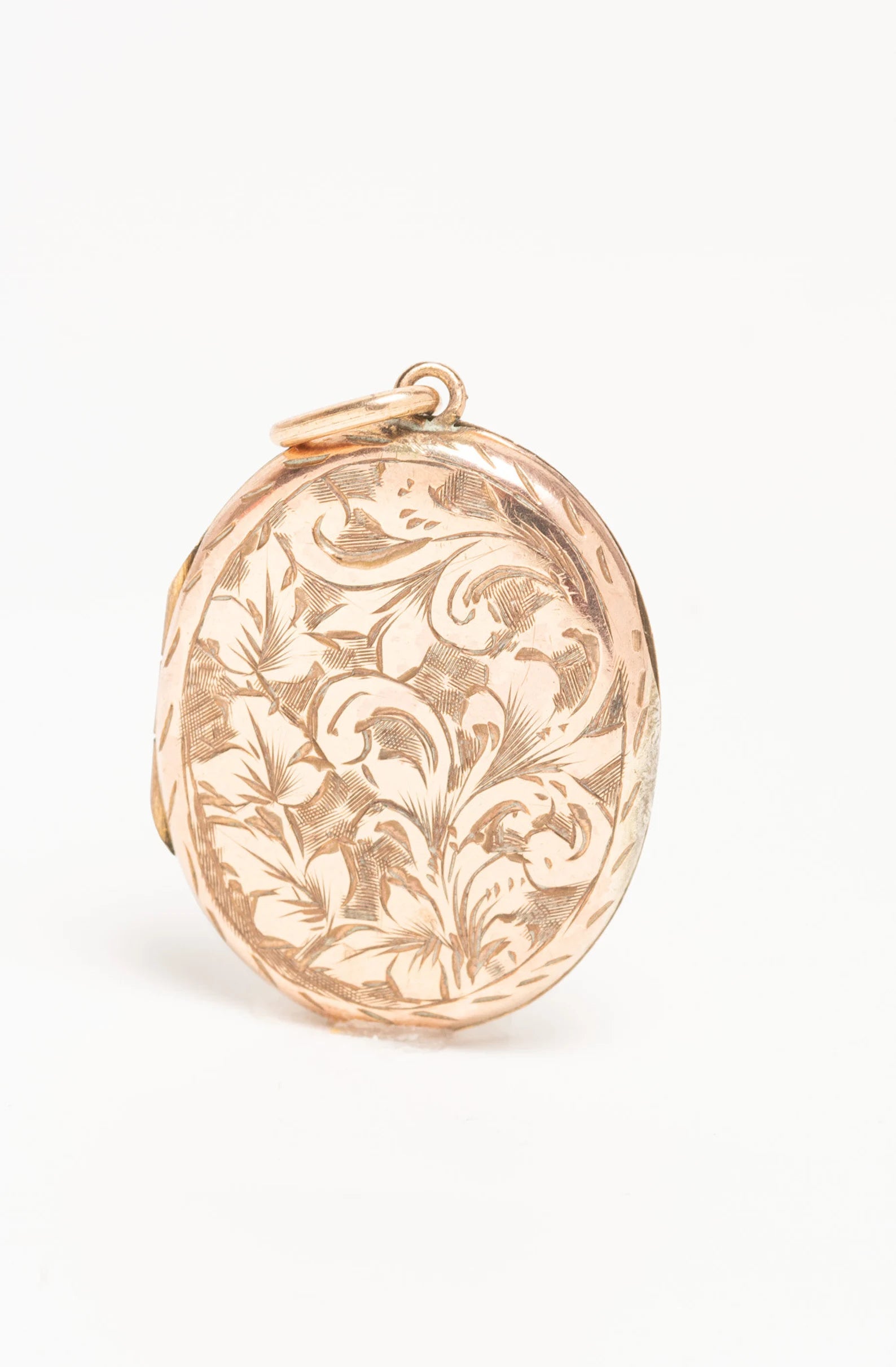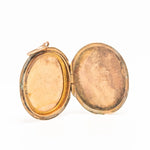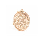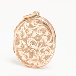 A lovely antique yellow metal oval Victorian locket with a floral design and. This locket has typical for the Victorian era floral motif with a beautiful cartouche on the back The locket opens to reveal two compartments for photographs. The locket closes securely with a click.
