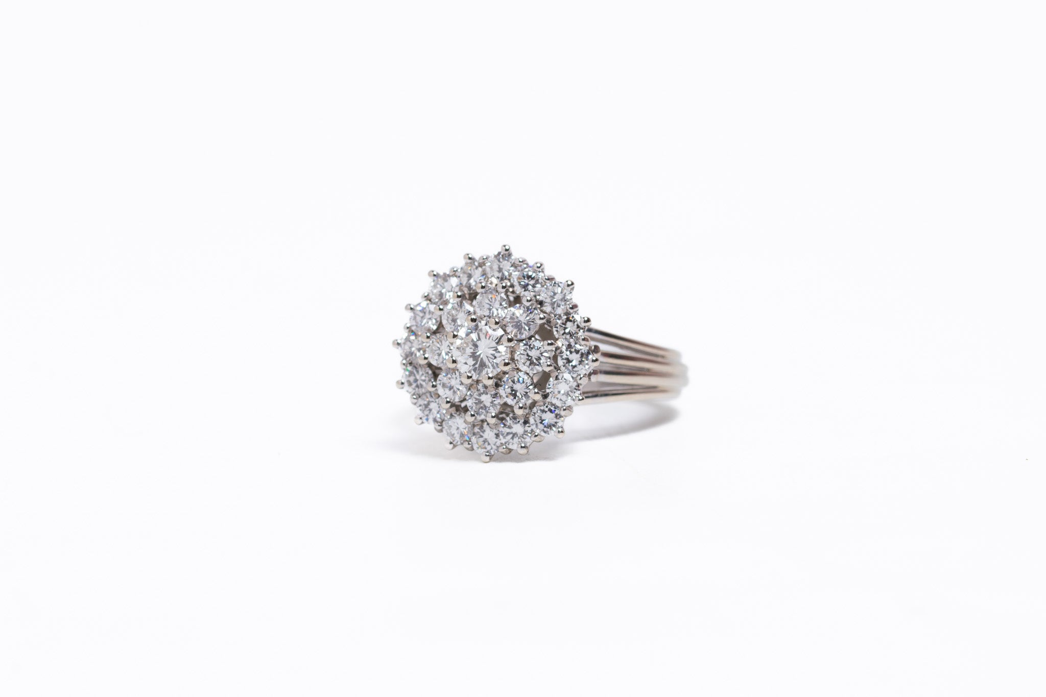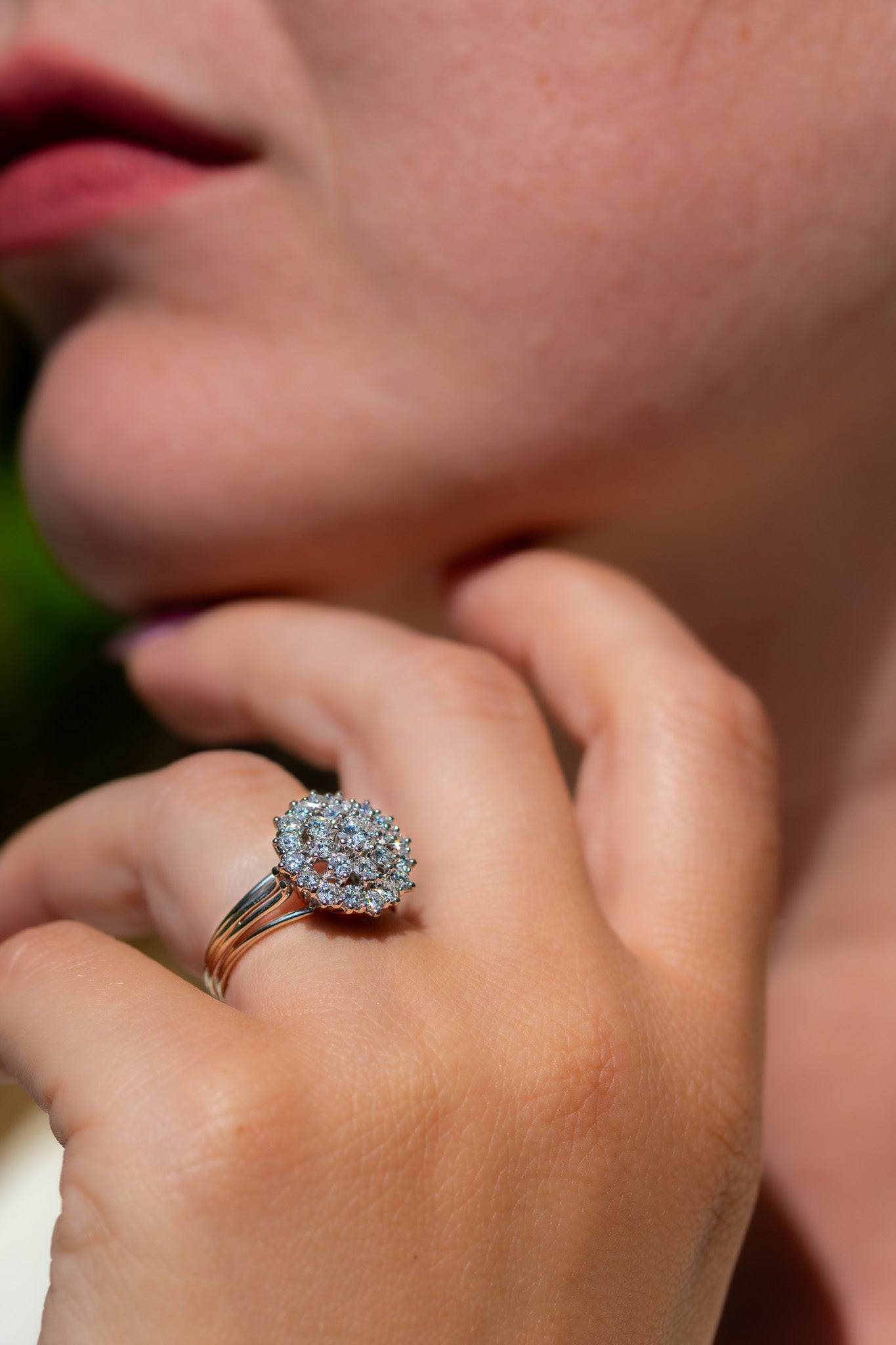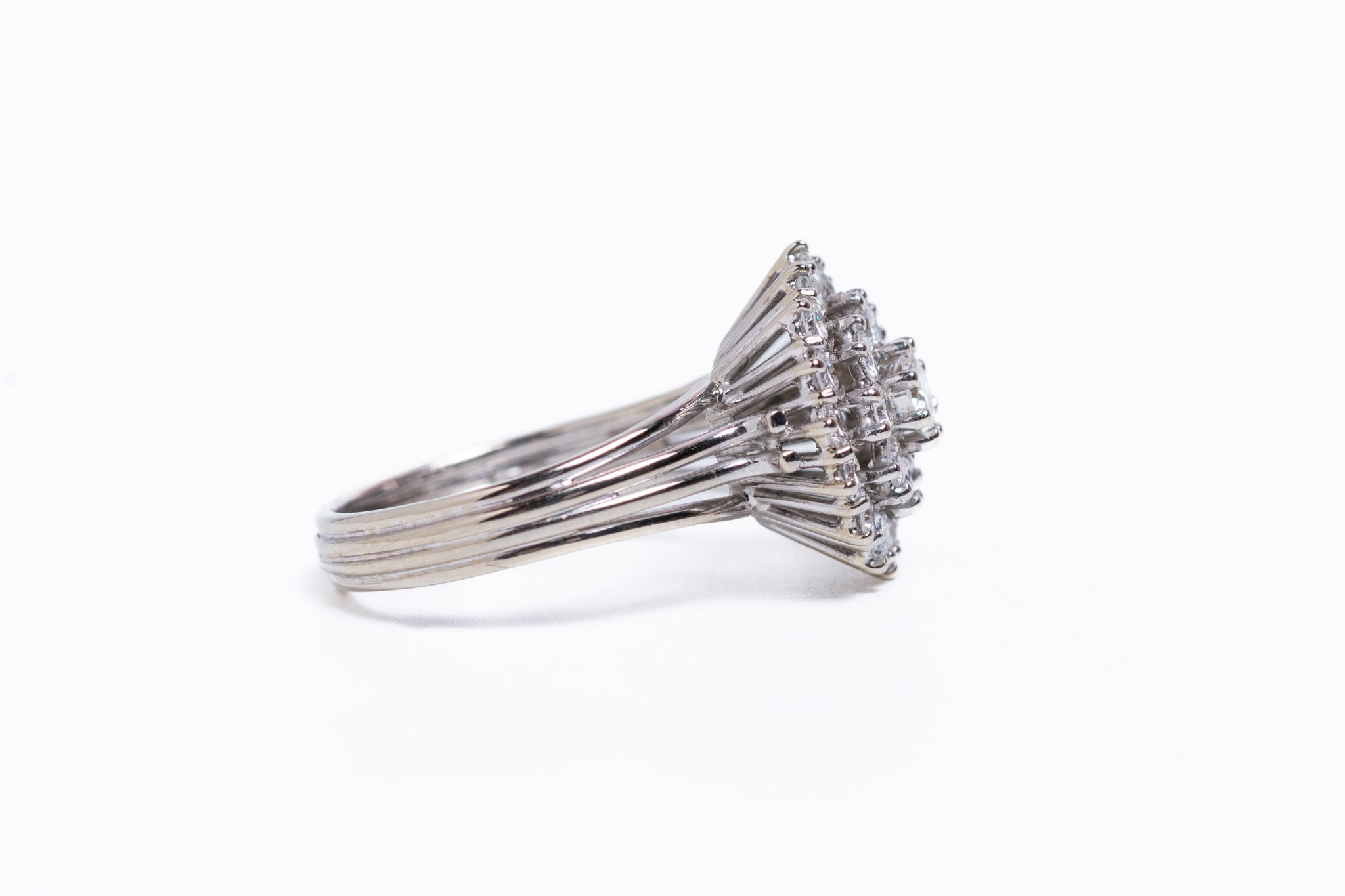 An extraordinary vintage diamond cocktail ring crafted in rich 18ct white gold, featuring a triple-tier cluster of 25 dazzling round brilliant-cut diamonds with a total estimated carat weight of 1.50ct. Designed in the late 20th century, this opulent piece radiates glamour from every angle. The high-profile domed setting is meticulously arranged in three graduating tiers, creating a striking floral burst of light and texture. Each diamond is individually claw-set to maximize brilliance, with the central stone elegantly raised to crown the formation. The mount is supported by a sophisticated four-strand split shank, tapering into a solid band for both strength and visual balance. A bold yet timeless statement, this ring was likely designed for cocktail soirées or high-society events. Ideal as a standout cocktail ring or unique engagement choice.