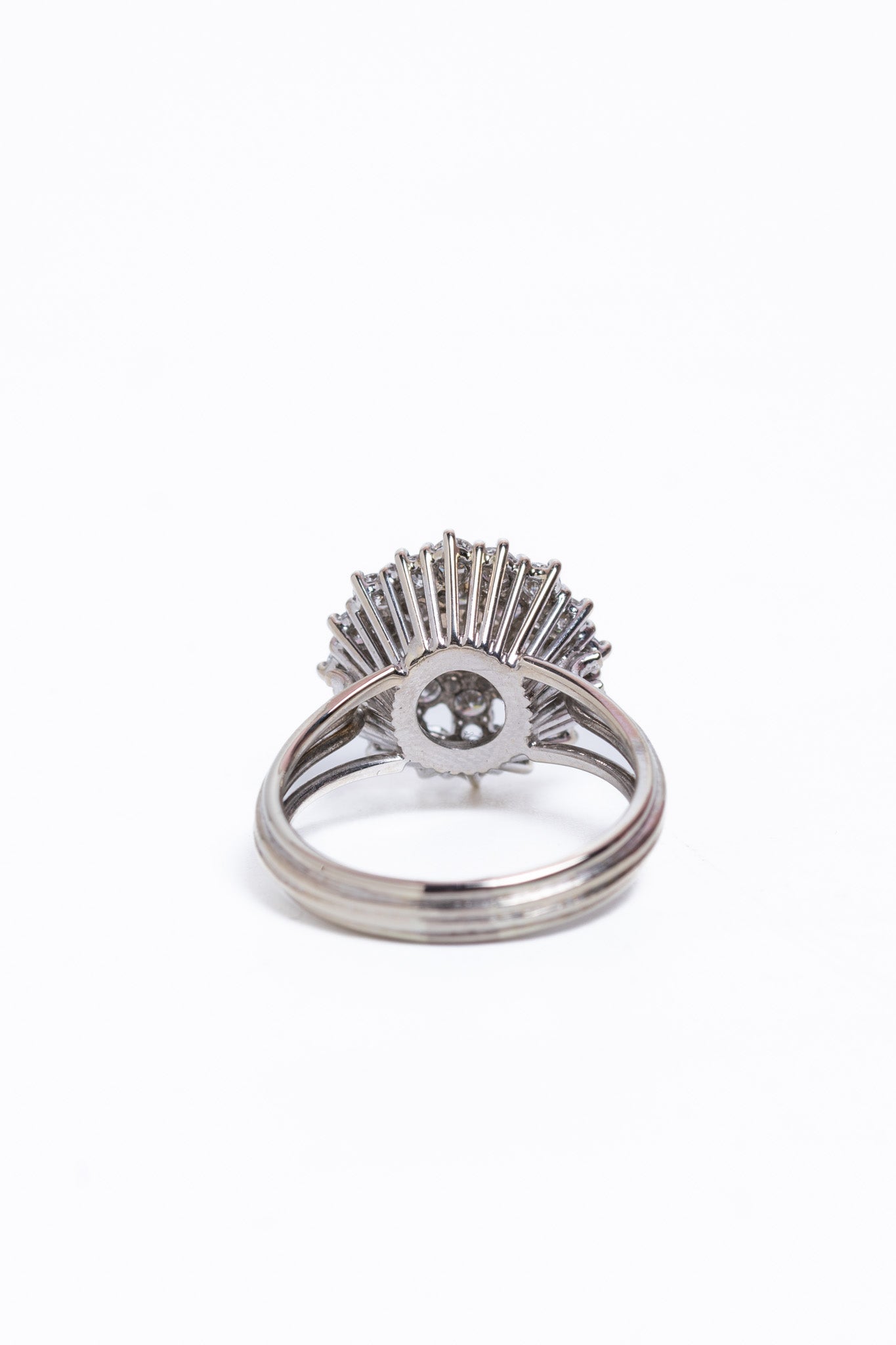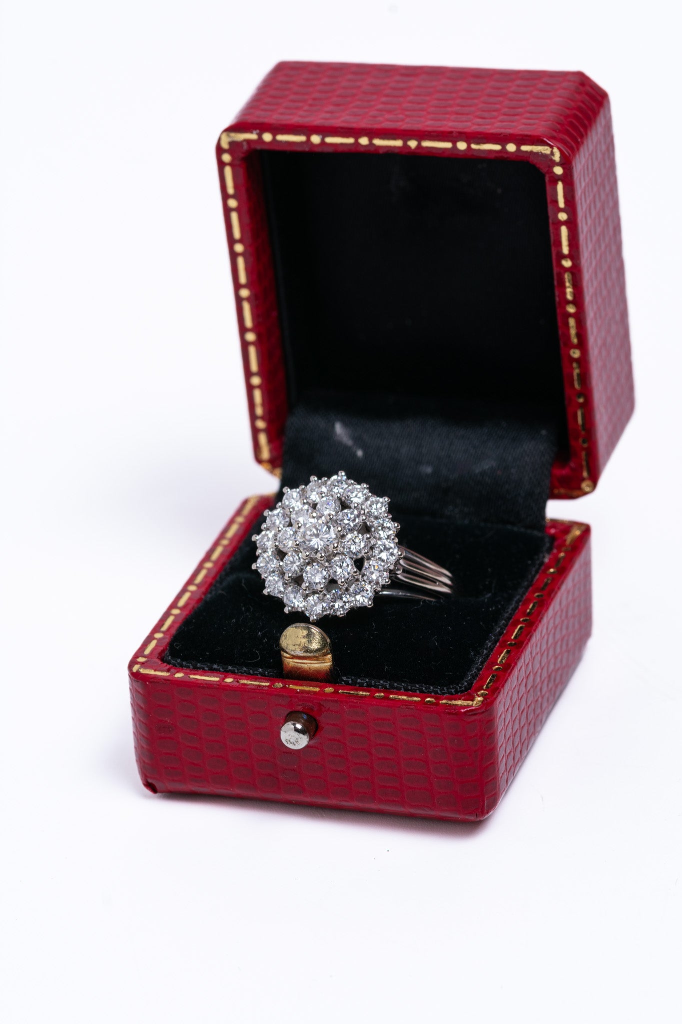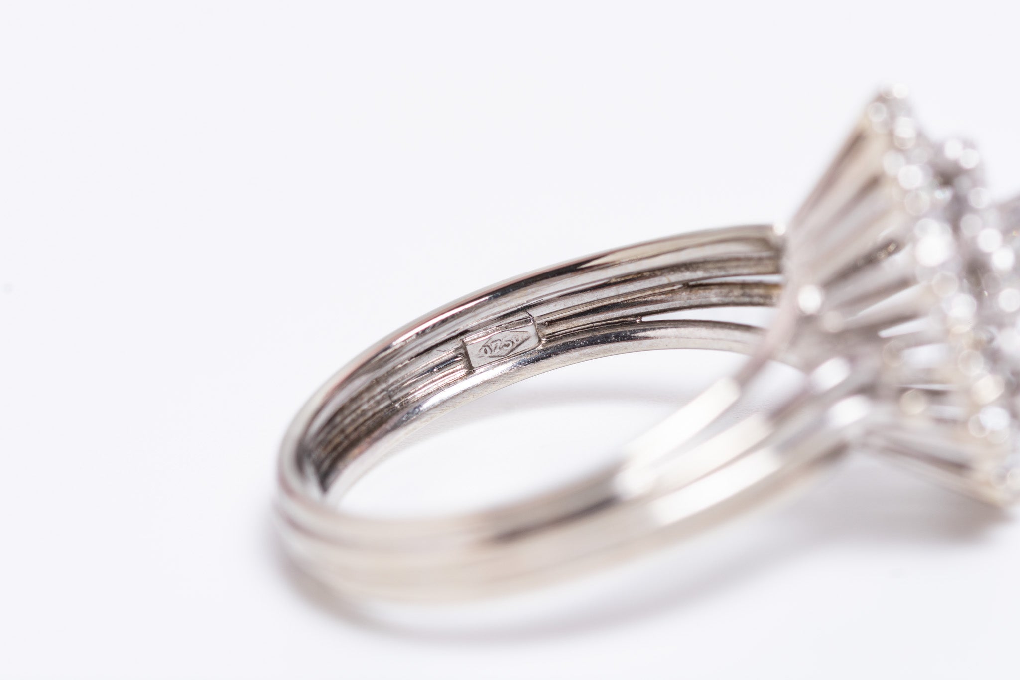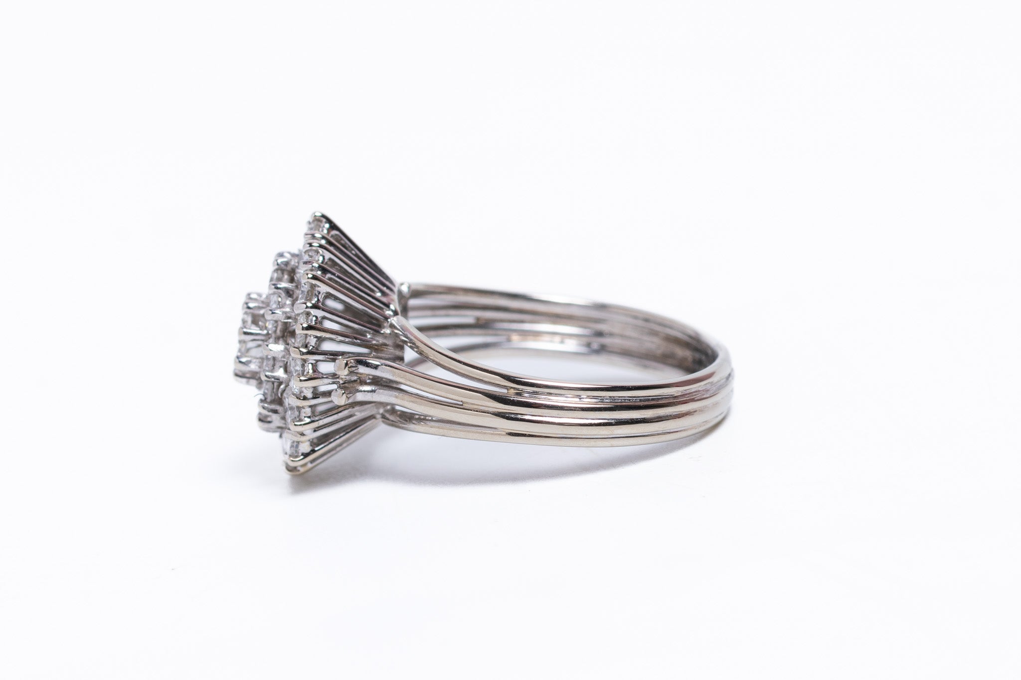 An extraordinary vintage diamond cocktail ring crafted in rich 18ct white gold, featuring a triple-tier cluster of 25 dazzling round brilliant-cut diamonds with a total estimated carat weight of 1.50ct. Designed in the late 20th century, this opulent piece radiates glamour from every angle. The high-profile domed setting is meticulously arranged in three graduating tiers, creating a striking floral burst of light and texture. Each diamond is individually claw-set to maximize brilliance, with the central stone elegantly raised to crown the formation. The mount is supported by a sophisticated four-strand split shank, tapering into a solid band for both strength and visual balance. A bold yet timeless statement, this ring was likely designed for cocktail soirées or high-society events. Ideal as a standout cocktail ring or unique engagement choice.