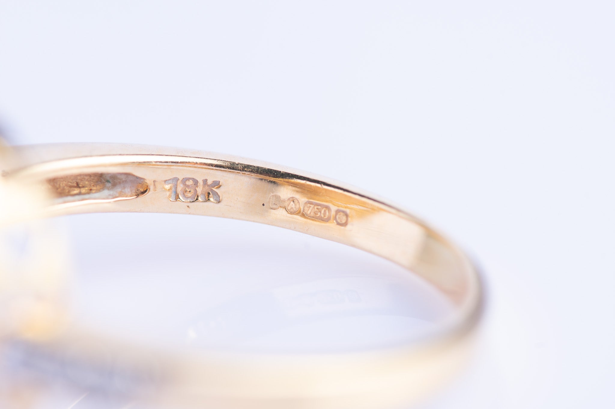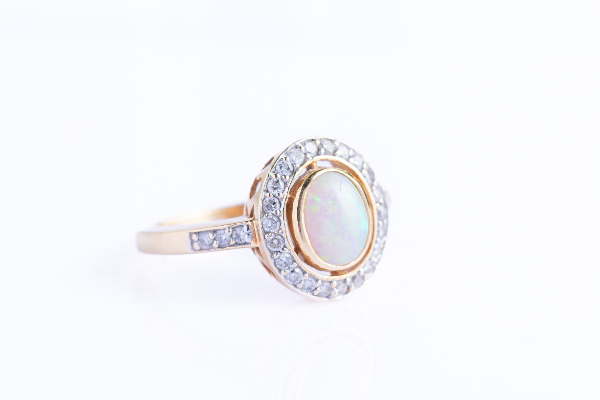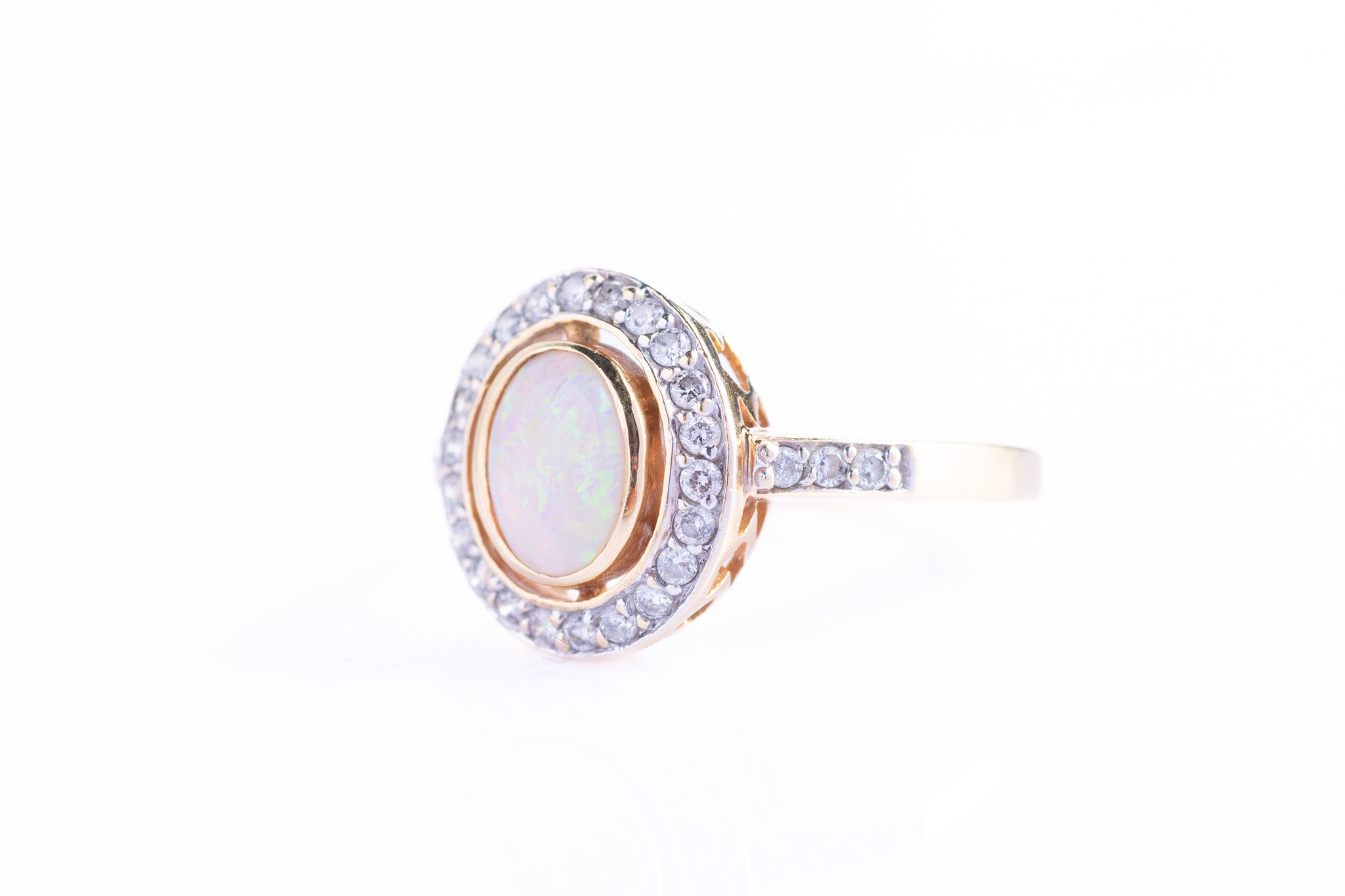 This stunning and luminous opal and diamond cluster ring is set in 18ct yellow gold. The central white opal cabochon shimmers with delicate play-of-colour, encircled by a halo of bright brilliant-cut diamonds set in yellow gold, with further diamonds gracing the shoulders for added sparkle. The harmonious mix of yellow gold enhances both the fire of the opal and the brilliance of the diamonds, making this ring a refined yet eye-catching piece. Elegant and timeless, it works beautifully as a statement jewel, an alternative engagement ring, or a thoughtful gift for an October birthday. Fully hallmarked for 18ct gold '18K' together with '750' mark and other marks.