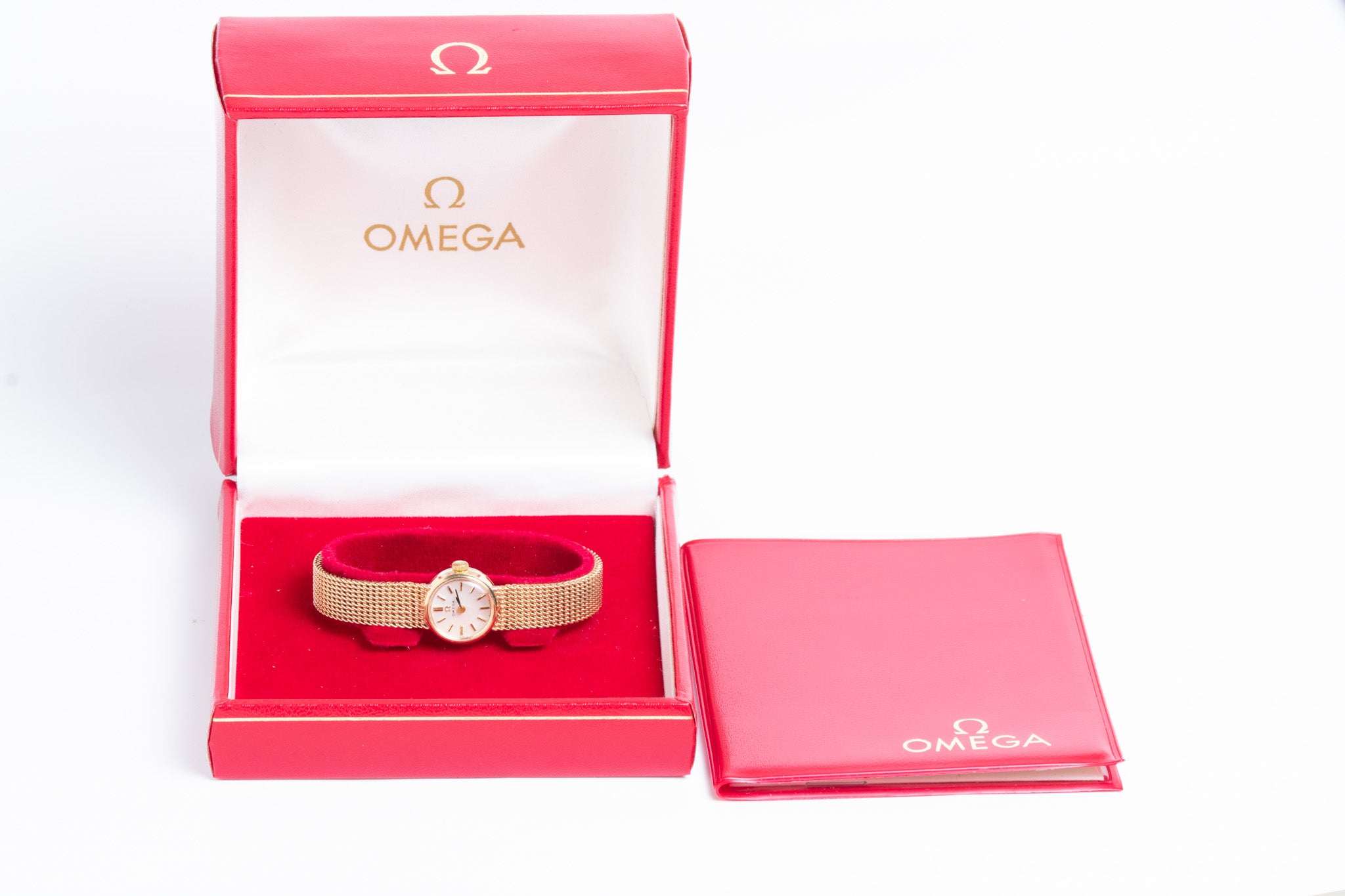 A beautiful vintage Ladies’ Omega wristwatch crafted in solid 9ct gold, offered as a complete original set with its Omega presentation box and Omega certificate/booklet. This elegant timepiece showcases Omega’s refined mid-century design with a timeless round dial, delicate hour markers, and a finely woven 9ct gold integral Milanese bracelet, with a ladder snap clasp. The watch is in a working order.