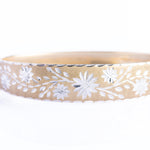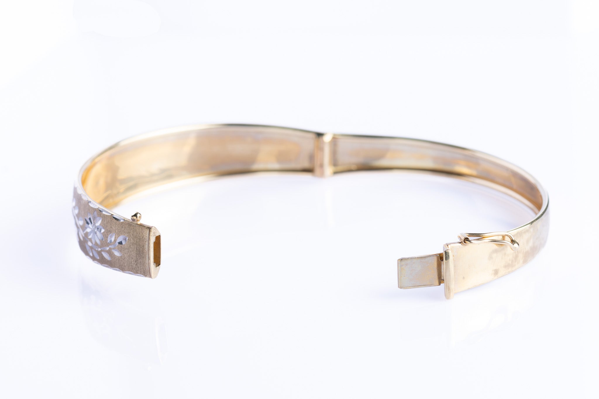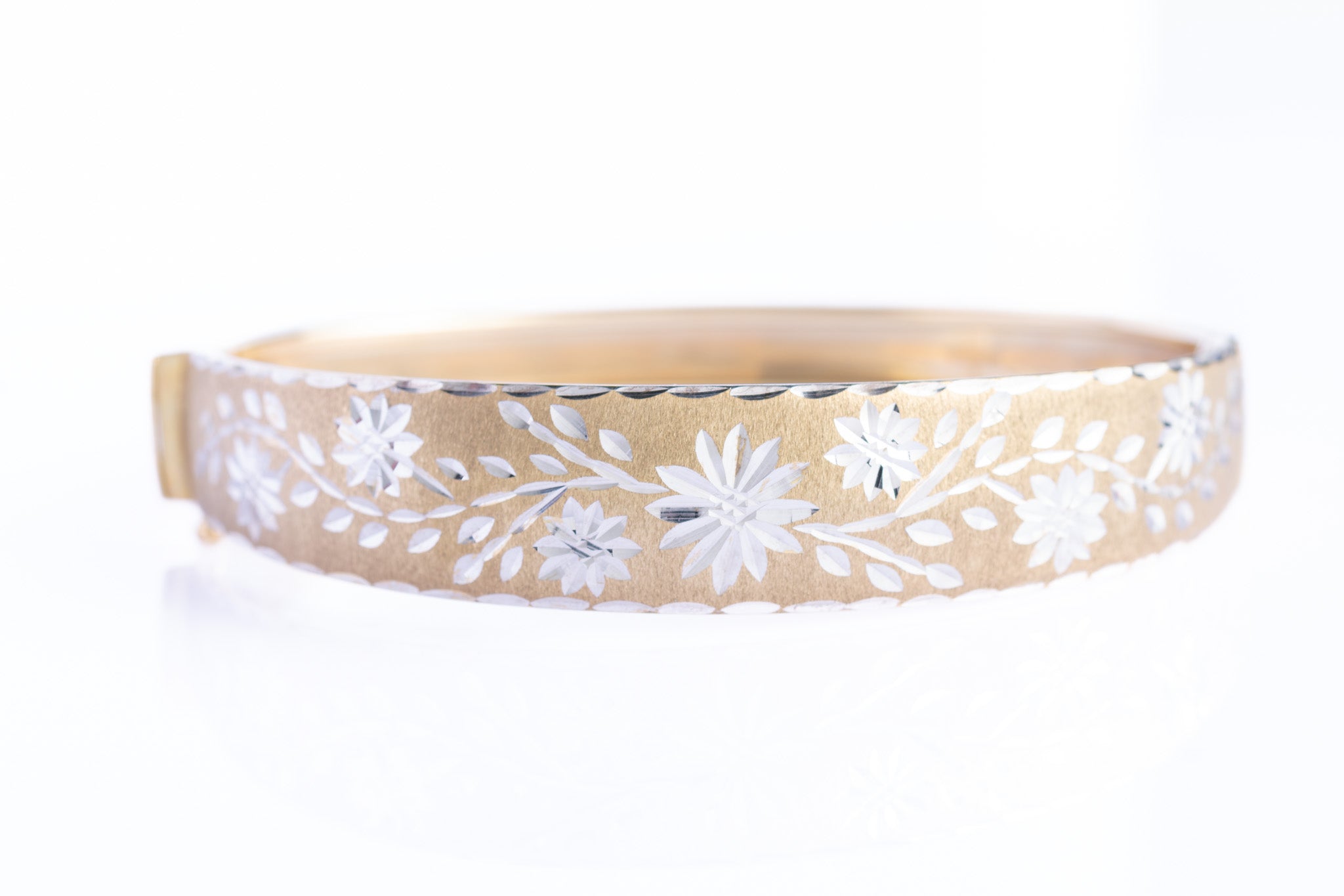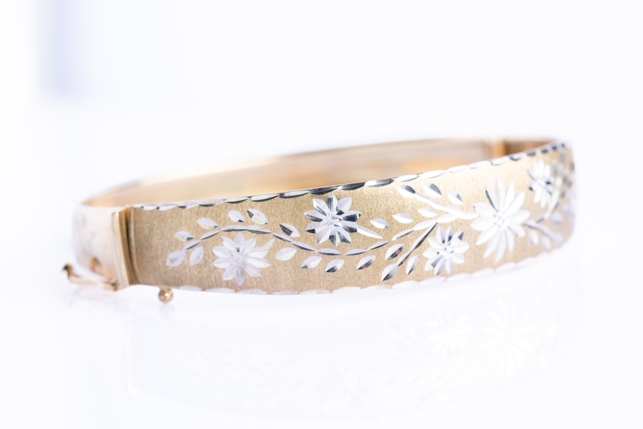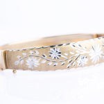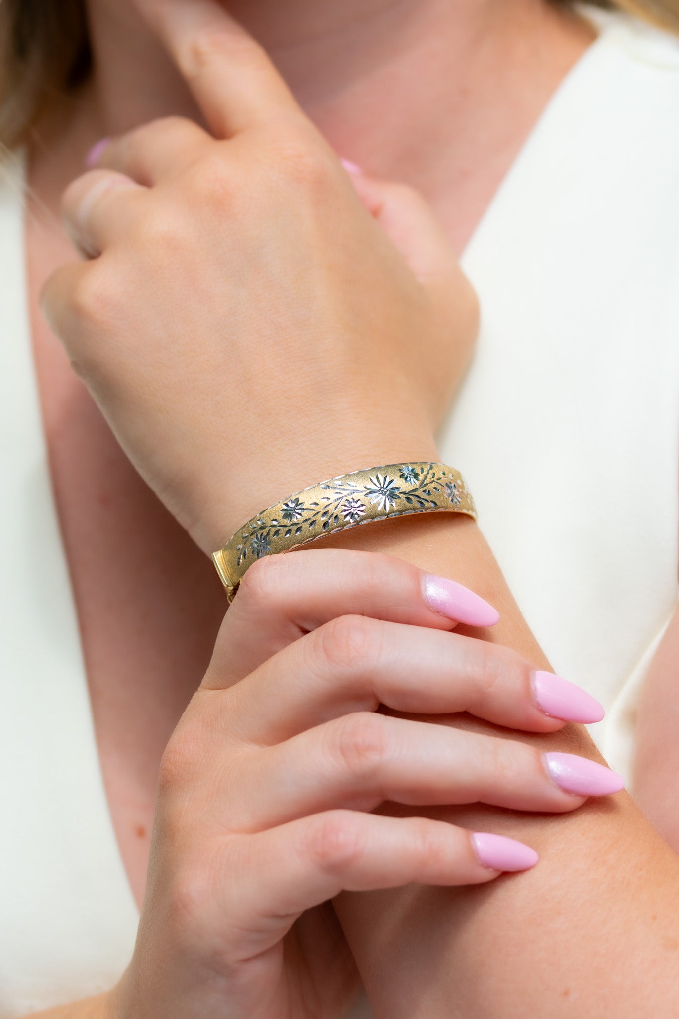 A vintage hinged bangle in two-tone 9ct gold, engraved with delicate floral and starburst motifs. The warm glow of yellow gold is contrasted with cool white gold detail, creating a piece that is both versatile and elegant. The hinge and clasp are seamlessly worked into the design, making it secure yet comfortable to wear. Whether worn alone as a statement or layered with other bracelets, this piece brings timeless charm and fine craftsmanship to any collection.