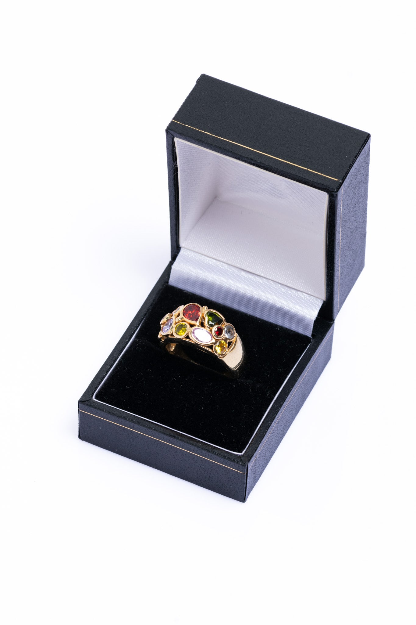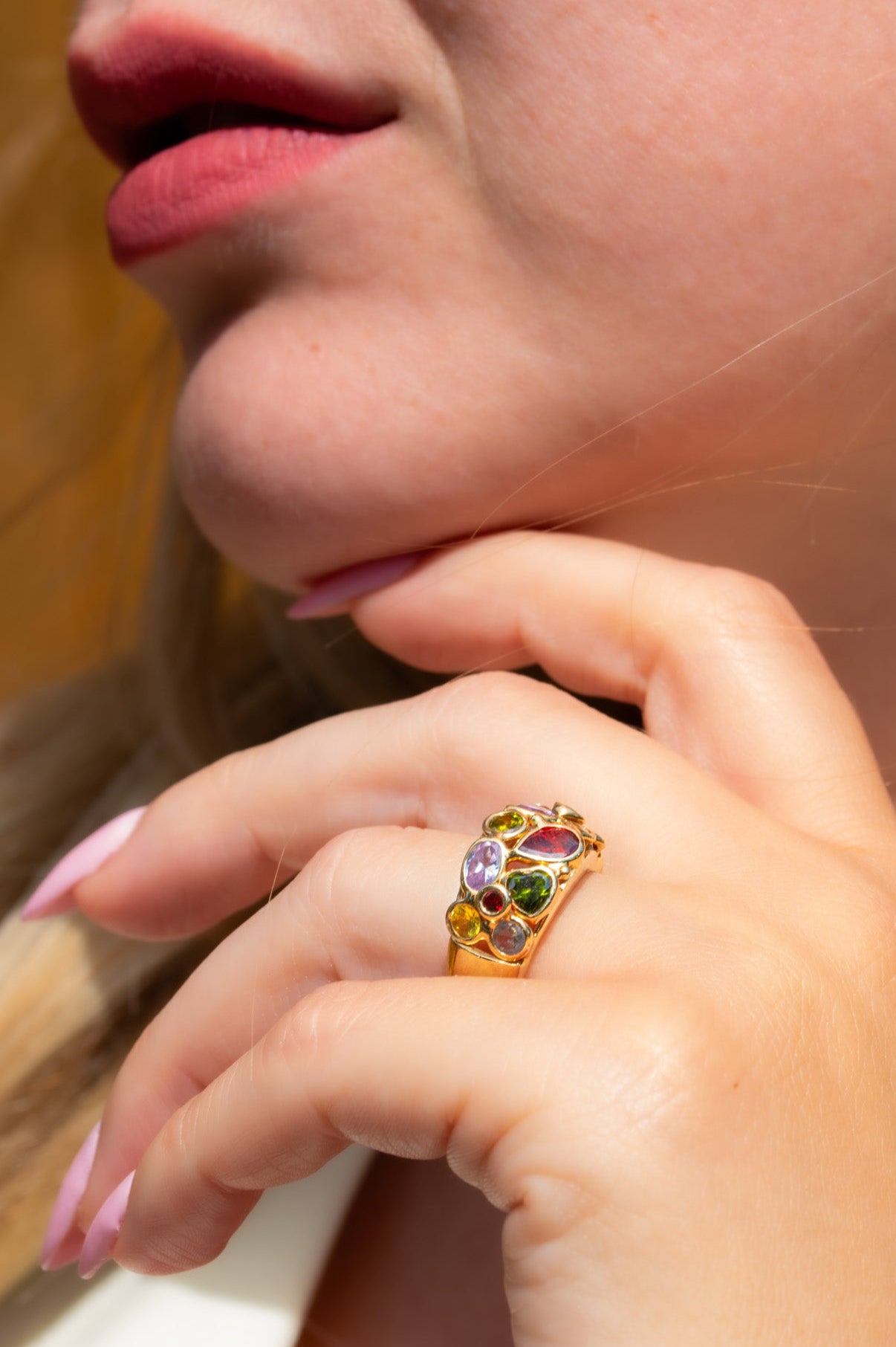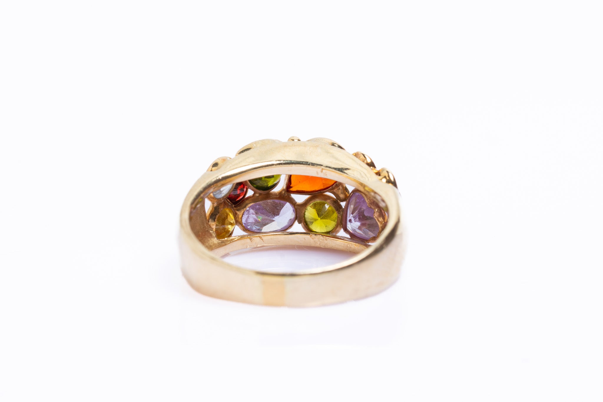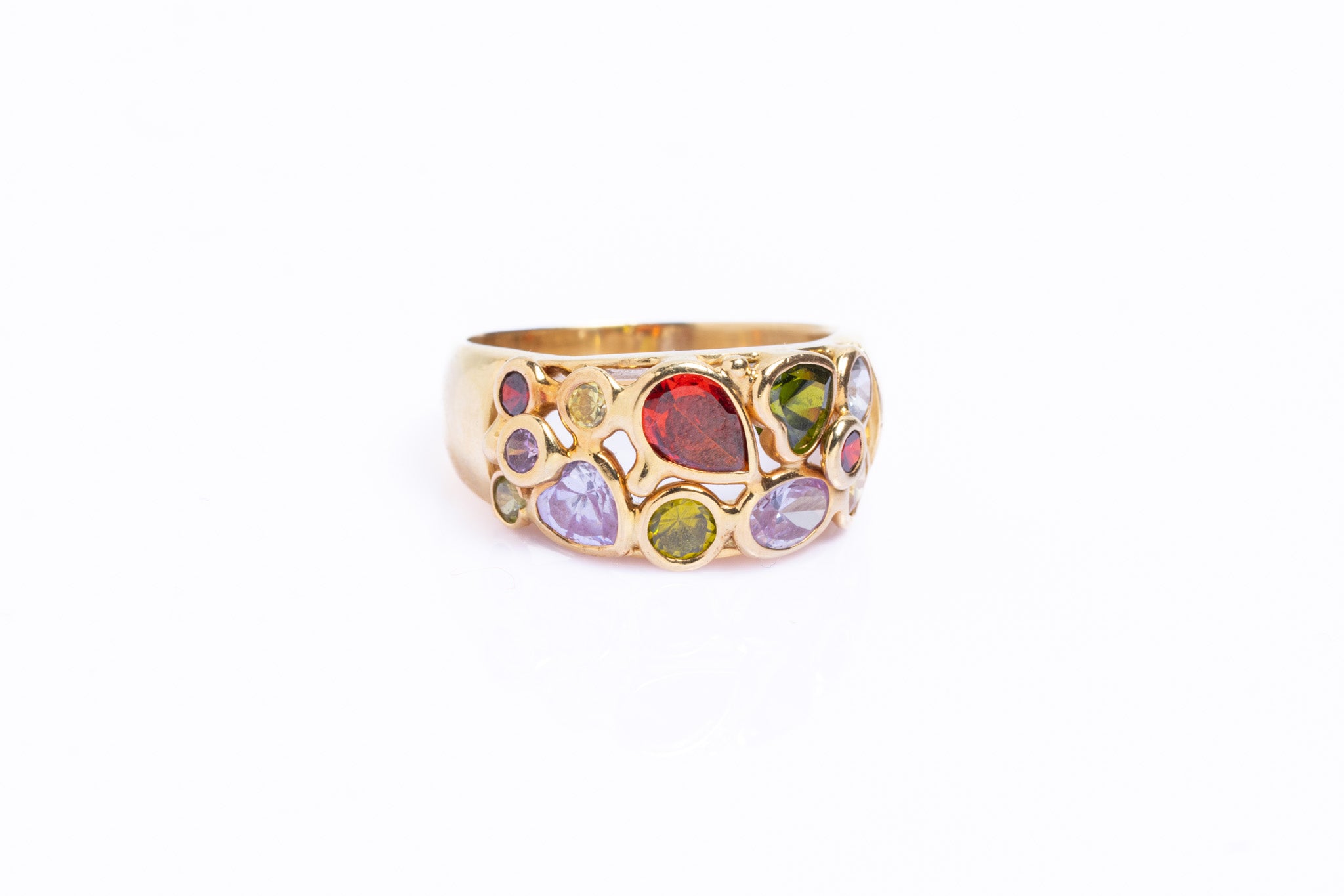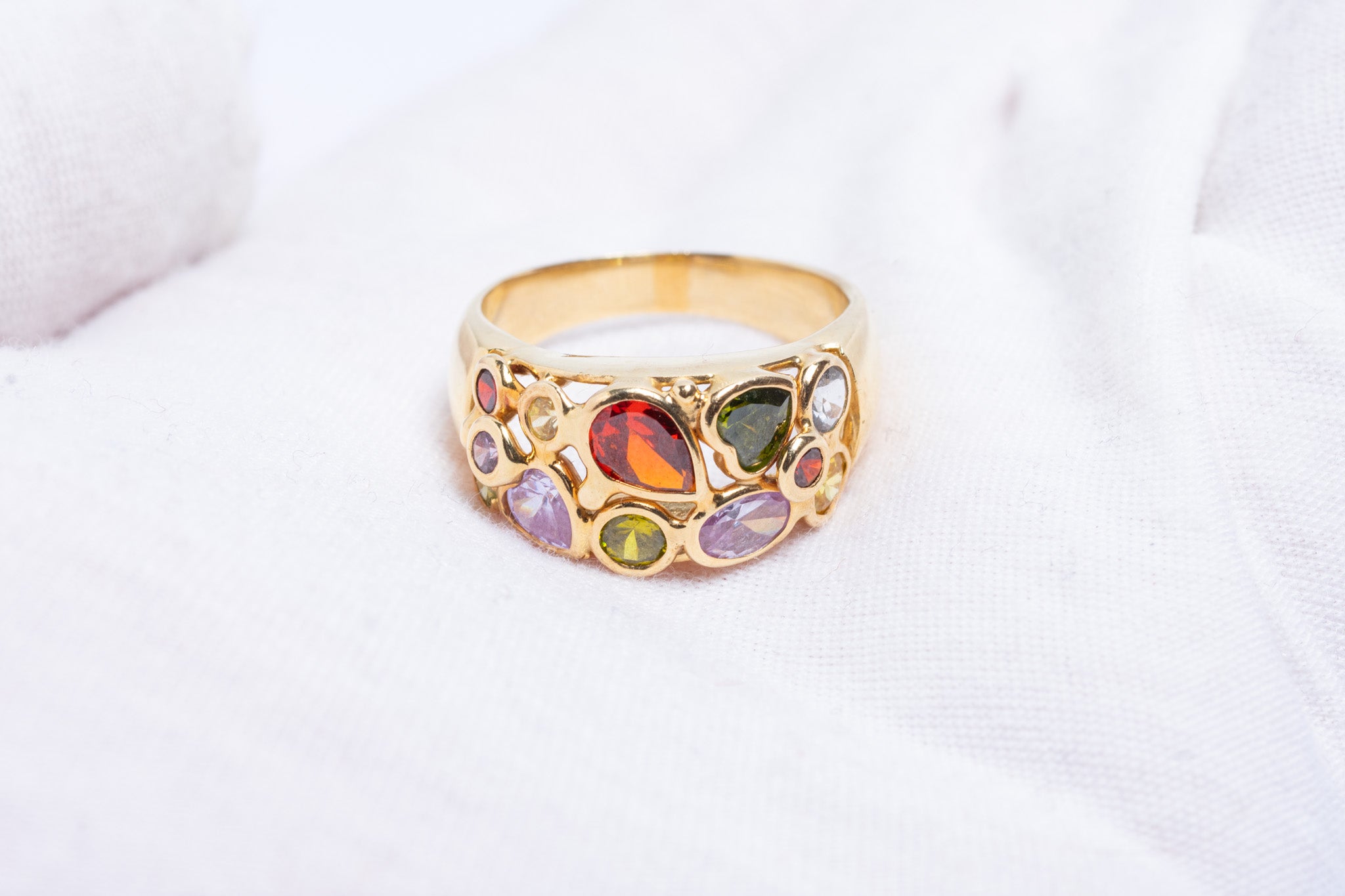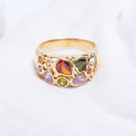 An exquisite vintage Italian bombe ring crafted in solid 14ct yellow gold, featuring a beautifully domed profile and richly coloured amethysts, topazes, garnets, citrines and tourmaline shaped in a round, heart and rain drop forms. This beautiful ring embodies glamorous style of mid-20th century Italian jewellery — luxurious, expressive, and finely made. The bombe design, with its voluminous gold form and intricate gemstone setting, was a signature of post-war Italian goldsmiths and remains highly sought after today.
