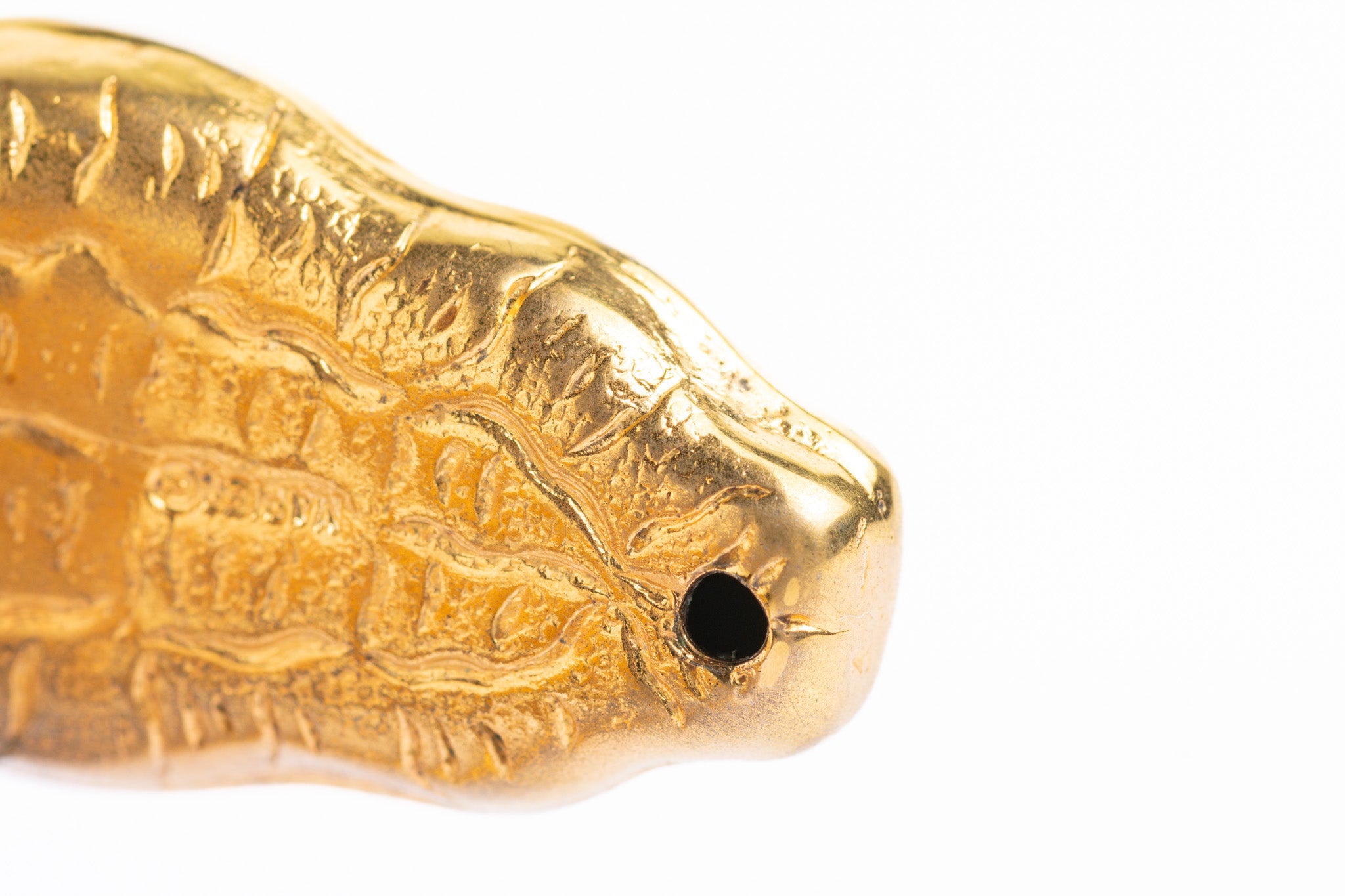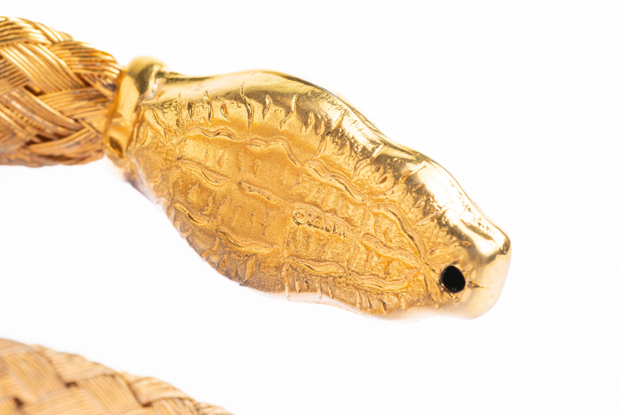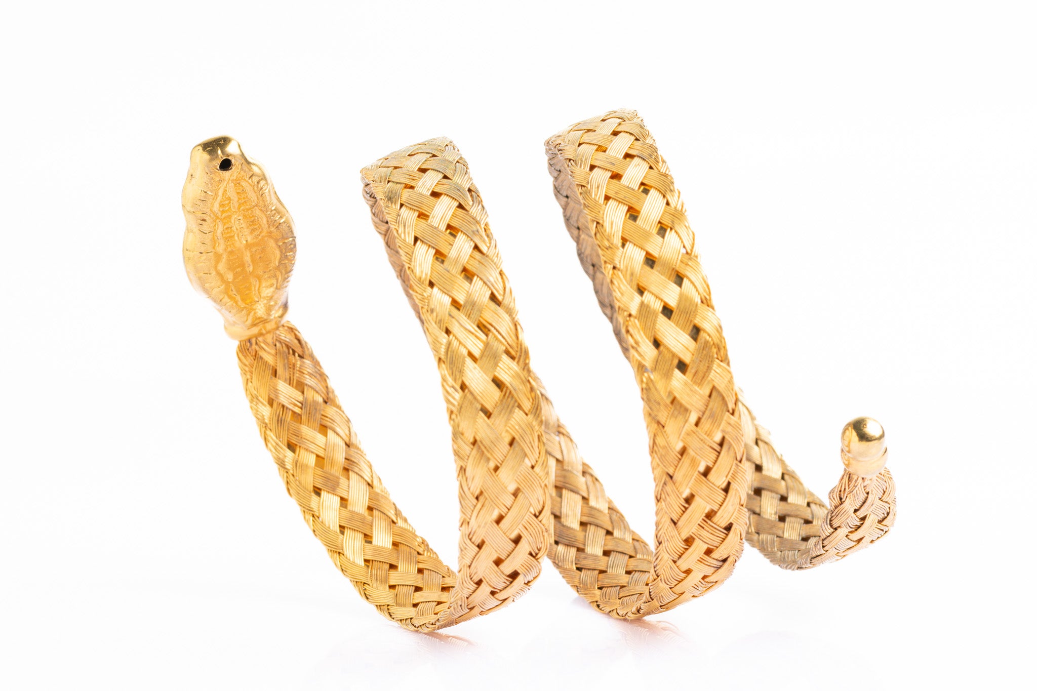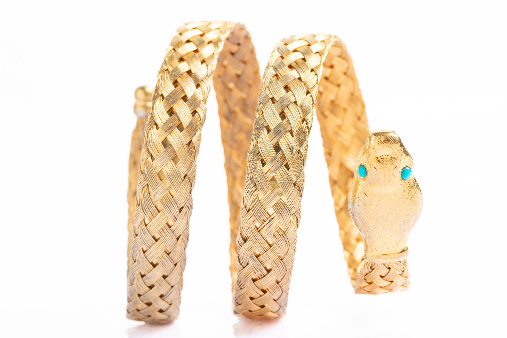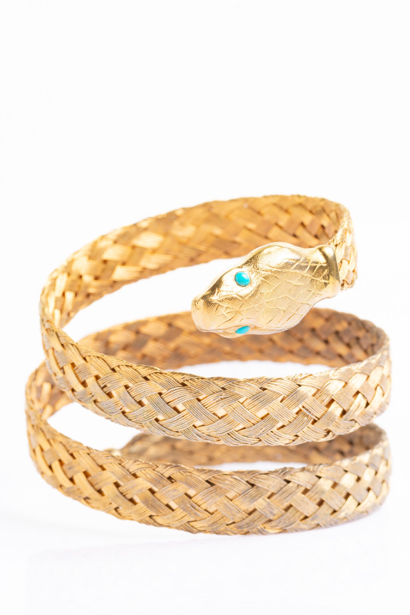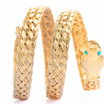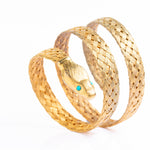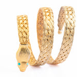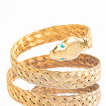 An extraordinary Victorian inspired snake bangle by Napier, crafted in rich gold-tone metal and set with glowing turquoise glass cabochons. The bangle features a textured woven body that elegantly mimics the scales of a serpent- an exquisite detail reminiscent of 19th-century gold snake jewellery. The serpent motif is a timeless emblem of eternal love and transformation.